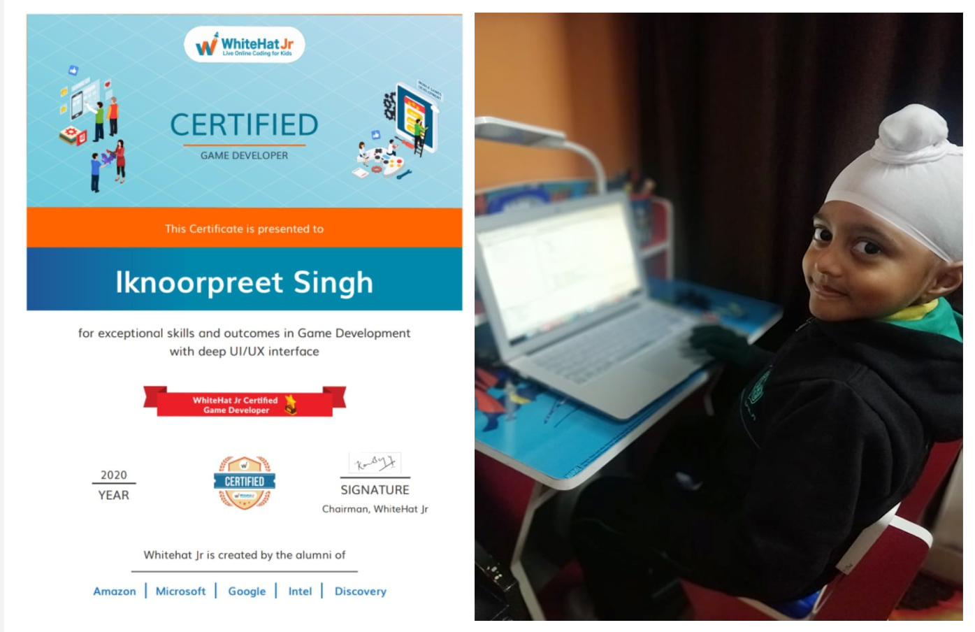 ਪਟਿਆਲਾ ਦੇ ਦਿੱਲੀ ਪਬਲਿਕ ਸਕੂਲ ਵਿੱਚ ਪੜ੍ਹਦਾ ਇਕਨੂਰਪ੍ਰੀਤ ਸਿੰਘ ਆਪਣਾ ਤੇ ਆਪਣੇ ਮਾਪਿਆ ਦਾ ਹੀ ਨਹੀਂ ਪੰਜਾਬ ਦਾ ਨਾਮ ਵੀ ਰੌਸ਼ਨ ਕਰ ਰਿਹਾ ਹੈ । ਇਕਨੂਰਪ੍ਰੀਤ ਸਿੰਘ ਹਾਲੇ ਪਹਿਲੀ ਜਮਾਤ ਦਾ ਹੀ ਵਿਦਿਆਰਥੀ ਹੈ ਤੇ ਵੱਡੇ-ਵੱਡਿਆ ਨੂੰ ਸੋਚਣ ਲਈ ਮਜਬੂਰ ਕਰ ਦਿੱਤਾ ਹੈ । ਇਕਨੂਰਪ੍ਰੀਤ ਸਿੰਘ ਛੇ ਸਾਲ ਦੀ ਉਮਰ ਵਿੱਚ ਗੇਮ-ਡਿਵੈਲਪਰ ਭਾਵ ਕੰਪਿਊਟਰ ਤੇ ਮੋਬਾਇਲ ਤੇ ਖੇਡੀਆ ਜਾਣ ਵਾਲੀ ਖੇਡਾਂ ਬਣਾਉਣ ਲੱਗ ਪਿਆ ਹੈ । ਅਜਿਹੀ ਖੇਡ ਬਣਾਉਣ ਤੇ ਉਸ ਨੂੰ WhiteHat Jr ਵੱਲੋਂ ਸਰਟੀਫਿਕੇਟ ਵੀ ਦਿੱਤਾ ਗਿਆ । ਇਕਨੂਰਪ੍ਰੀਤ ਇਸ ਵੇਲੇ ਪੰਜਾਬ ਦਾ ਸਭ ਤੋਂ ਛੋਟੀ ਉਮਰ ਦਾ ਗੇਮ ਡਿਵੈਲਪਰ ਹੈ । ਅਦਾਰਾ ਪੰਜਾਬੀ ਨਿਊਜ ਆਨਲਾਈਨ ਇਕਨੂਰਪ੍ਰੀਤ ਸਿੰਘ ਨੂੰ ਉਸ ਦੀ ਇਸ ਕਾਮਯਾਬੀ ਤੇ ਵਧਾਈ ਦਿੰਦਾ ਹੈ ਤੇ ਉਨ੍ਹਾਂ ਦੇ ਪਿਤਾ ਜੋਗਿੰਦਰ ਸਿੰਘ ਮਹਿਰਾ ਜੋ ਖੁਦ ਇੱਕ ਵੈਬ ਡਿਜਾਈਨਰ ਹਨ ਦਾ ਸਾਡੇ ਅਦਾਰੇ ਨਾਲ ਜੁੜੇ ਹੋਣ ਕਾਰਨ ਅਸੀ ਹੋਰ ਵੀ ਮਾਣ ਮਹਿਸੂਸ ਕਰਦੇ ਹਾਂ । ਪੰਜਾਬੀ ਨਿਊਜ ਆਨਲਾਈਨ ਨਾਲ ਗੱਲਬਾਤ ਦੌਰਾਨ ਜੋਗਿੰਦਰ ਸਿੰਘ ਨੇ ਦੱਸਿਆ ਕਿ ਇਕਨੂਰਪ੍ਰੀਤ ਦਾ ਧਿਆਨ ਹੁਣੇ ਤੋਂ ਹੀ ਕੰਪਿਊਟਰ ਪ੍ਰੋਗਰਾਮਿੰਗ ਵੱਲ ਲੱਗ ਗਿਆ ਹੈ ਕਈ ਗੇਮਾਂ ਬਣਾ ਚੁੱਕਿਆ ਹੈ । ਹੁਣ ਇਕਨੂਰਪ੍ਰੀਤ ਦੀ ਗੇਮ ਗੂਗਲ ਪਲੇ ਸਟੋਰ ਉੱਪਰ ਵੀ ਆ ਜਾਵੇਗੀ । ਦੁਨੀਆ ਵਿੱਚ ਸਿਰਫ ਕੁਝ ਹੀ ਬੱਚੇ ਹਨ ਜੋ ਛੇ ਸਾਲ ਜਾਂ ਉਸ ਤੋਂ ਘੱਟ ਉਮਰ ਵਿੱਚ ਇਸ ਤਰ੍ਹਾਂ ਦੀ ਪ੍ਰੋਗਰਾਮਿੰਗ ਕਰ ਰਹੇ ਹਨ ਇਕਨੂਰਪ੍ਰੀਤ ਸਿੰਘ ਵੀ ਉਨ੍ਹਾਂ ਵਿੱਚੋਂ ਇੱਕ ਹੈ ।