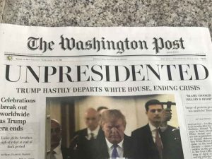 ਮੁੱਖ ਪੇਜ ‘ਤੇ ਹੈਡਲਾਈਨ 6 ਕਾਲਮ ਦੀ ਹੈ ਅਤੇ ਇਸ ਵਿੱਚ ਵੱਡੇ -ਵੱਡੇ ਅੱਖਰਾਂ ‘ਚ ਲਿਖਿਆ ‘ ਅਨਪ੍ਰੈਜੀਡੇਂਟੇਡ ‘ ਭਾਵ ,’ ਰਾਸ਼ਟਰਪਤੀ ਦੇ ਅਹੁਦੇ ਤੋਂ ਪਾਸੇ’ । ਇਸ ਵਿੱਚ ਰਾਸ਼ਟਰਪਤੀ ਟਰੰਪ ਦੀ ਗੁੱਸੇ ਵਿੱਚ ਸਿਰ ਝੁਕਾਏ ਦੀ ਫੋਟੋ ਲਾਈ ਹੈ। ਨਾਲ ਲਿਖਿਆ ,’ ਟਰੰਪ ਦੇ ਜਲਦਬਾਜੀ ਵਿੱਚ ਵਾਈਟ ਹਾਊਸ ਛੱਡਣ ਨਾਲ ਐਂਮਜਰੈਸੀ ਦਾ ਅੰਤ’