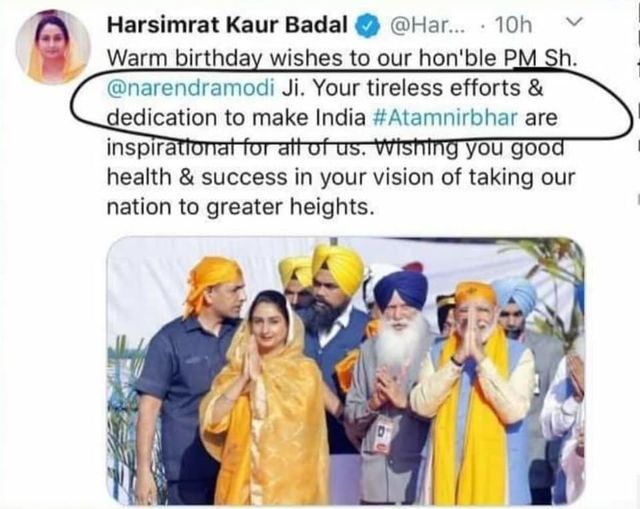 ਅੱਜ ਸਵੇਰੇ ਪ੍ਰਧਾਨ ਮੰਤਰੀ ਦਾ ਗੁਣਗਾਨ ਕਰਦੇ ਹੋਏ ਬੀਬੀ ਹਰਸਿਮਰਤ ਕੌਰ ਬਾਦਲ ਨੇ ਵਧਾਈ ਦਿੱਤੀ ਅਤੇ ਆਥਣੇ ਟਵਿੱਟਰ ਤੇ ਅਸਤੀਫਾ ਦੇਣ ਦਾ ਐਲਾਨ ਕਰਤਾ ।