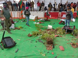 ਜ਼ਿਲ੍ਹੇ ਦੇ ਕੈਮਲਾ ਪਿੰਡ ਵਿੱਚ ਅੱਜ ਮੁੱਖ ਮੰਤਰੀ ਮਨੋਹਰ ਲਾਲ ਖੱਟਰ ਦੀ’ ਕਿਸਾਨ ਮਹਾਂਪੰਚਾਇਤ ‘ਦਾ ਵਿਰੋਧ ਕਰਨ ਲਈ ਟਰੈਕਟਰਾਂ, ਐੱਸਯੂਵੀ, ਕਾਰਾਂ ਅਤੇ ਸਾਈਕਲਾਂ ਵੱਲ ਮਾਰਚ ਕਰਨ ਵਾਲੇ ਕਿਸਾਨਾਂ ’ਤੇ ਪੁਲੀਸ ਨੇ ਅੱਥਰੂ ਗੈਸ ਦੇ ਗੋਲੇ ਬਰਸਾਏ ਤੇ ਜਲ ਤੋਪਾਂ ਦੀ ਵਰਤੋਂ ਕੀਤੀ। ਪੁਲੀਸ ਦੀ ਕਾਰਵਾਈ ਦੇ ਬਾਵਜੂਦ ਸੈਂਕੜੇ ਕਿਸਾਨ ਕੈਮਲਾ ਪਿੰਡ ਵਿੱਚ ਦਾਖਲ ਹੋ ਗਏ। ਉਨ੍ਹਾਂ ਨੇ ਸਟੇਜ ਦੀਆਂ ਦੀ ਭੰਨ ਤੋੜ ਕੀਤੀੇ। ਕੈਮਲਾ ਰੋਡ ‘ਤੇ ਘੜੂੰਦਾ ਵਿਖੇ ਲਗਾਏ ਗਏ ਪਹਿਲੇ ਬੈਰੀਕੇਡਾਂ ਨੂੰ ਪਾਰ ਕਰਨ ਵਿਚ ਸਫਲ ਹੋ ਗਏ। ਕਰਨਾਲ ਦੇ ਐੱਸਪੀ ਗੰਗਾ ਰਾਮ ਪੁਨੀਆ ਨੇ ਕਿਸਾਨਾਂ ਨੂੰ ਸ਼ਾਂਤ ਕਰਨ ਦੀ ਕੋਸ਼ਿਸ਼ ਕੀਤੀ ਪਰ ਕਿਸਾਨਾਂ ਨੇ ਦੂਸਰੇ ਬੈਰੀਕੇਡਾਂ ਨੇੜੇ ਧਰਨਾ ਲਗਾਇਆ, ਕਿਉਂਕਿ ਉਨ੍ਹਾਂ ਦੇ ਆਗੂ ਅੱਗੇ ਦੀ ਰਣਨੀਤੀ ਬਾਰੇ ਵਿਚਾਰ ਵਟਾਂਦਰੇ ਕਰ ਰਹੇ ਹਨ। ਪੁਲੀਸ ਨੇ ਕਿਸਾਨਾਂ ਨੂੰ ਅੱਗੇ ਜਾਣ ਤੋਂ ਰੋਕਣ ਲਈ ਹੁਣ ਕੈਮਲਾ ਰੋਡ ’ਤੇ ਟਰੱਕ ਖੜੇ ਕਰ ਦਿੱਤੇ ਹਨ। ਚਾਰ ਐੱਸਪੀ ਅਤੇ 12 ਤੋਂ ਵੱਧ ਡੀਐਸਪੀ ਦੀ ਅਗਵਾਈ ਵਿੱਚ ਆਸ ਪਾਸ ਦੇ ਜ਼ਿਲ੍ਹਿਆਂ ਦੀ ਪੁਲੀਸ ਵੱਖ-ਵੱਖ ਐਂਟਰੀ ਪੁਆਇੰਟਾਂ ’ਤੇ ਤਾਇਨਾਤ ਕੀਤੀ ਗਈ ਹੈ।ਪੁਲੀਸ ਵੱਲੋਂ ਰੋਕਣ ਤੋਂ ਬਾਅਦ ਬਹੁਤ ਸਾਰੇ ਕਿਸਾਨਾਂ ਨੇ ਬੈਰੀਕੇਡ ਪਾਰ ਕਰਨ ਲਈ ਆਪਣੇ ਵਾਹਨ ਪਿੱਛੇ ਛੱਡ ਕੇ ਪੈਦਲ ਮਾਰਚ ਸ਼ੁਰੂ ਕਰ ਦਿੱਤਾ। ਇਸ ਦੌਰਾਨ ਕਿਸਾਨ ਨੇਤਾਵਾਂ ਨੇ ਆਪਣੇ ਸਾਥੀਆਂ ਨੂੰ ਸ਼ਾਂਤੀ ਬਰਕਰਾਰ ਰੱਖਣ ਲਈ ਕਿਹਾ।
