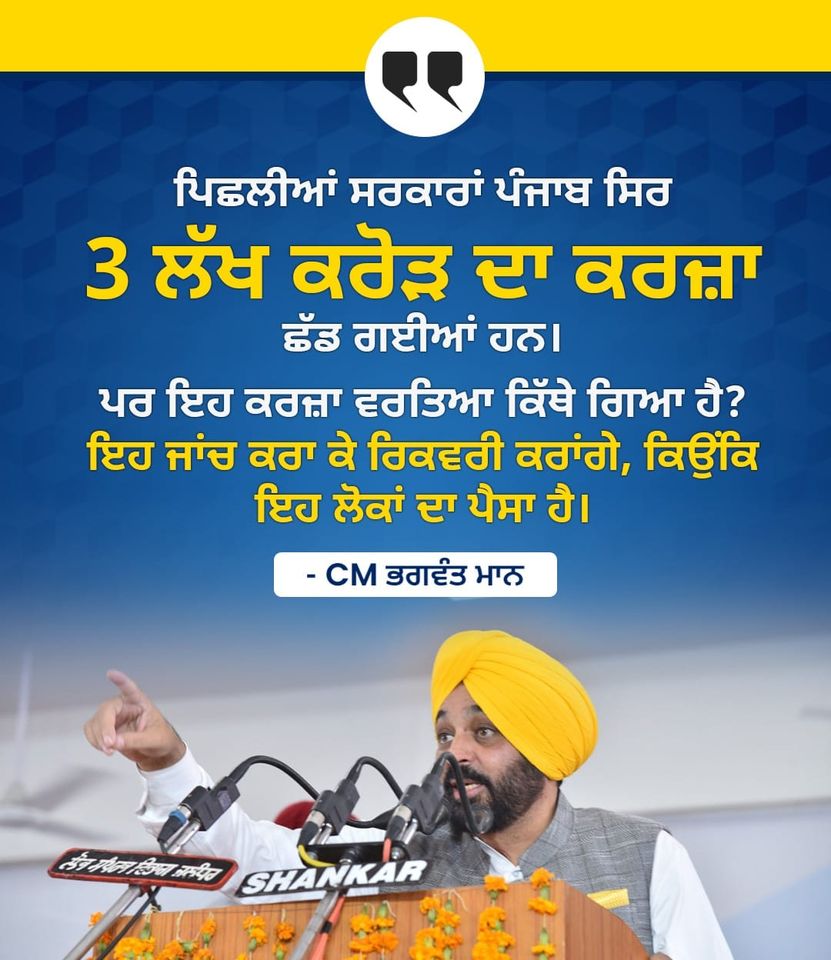 ਪੰਜਾਬ ਸਿਰ ਪਿਛਲੀਆਂ ਸਰਕਾਰਾਂ ਵੇਲੇ ਚੜ੍ਹੇ ਕਰਜ਼ੇ ਨੂੰ ਲੈ ਕੇ ਪੰਜਾਬ ਸਰਕਾਰ ਵੱਡੇ ਐਕਸ਼ਨ ਦੀ ਤਿਆਰੀ ਵਿੱਚ ਹੈ। ਪੰਜਾਬ ਦੇ ਮੁੱਖ ਮੰਤਰੀ ਭਗਵੰਤ ਮਾਨ ਨੇ ਕਿਹਾ ਹੈ ਕਿ ਪਿਛਲ਼ੀਆਂ ਸਰਕਾਰਾਂ ਵੇਲੇ ਪੰਜਾਬ ਸਿਰ ਚੜ੍ਹੇ 3 ਲੱਖ ਕਰੋੜ ਦੇ ਕਰਜ਼ੇ ਨੂੰ ਲੈ ਕੇ ਜਾਂਚ ਕਰਵਾਈ ਜਾਵੇਗੀ। ਇੰਨਾ ਹੀ ਨਹੀਂ ਸੀਐੱਮ ਮਾਨ ਨੇ ਰਿਕਵਰੀ ਕਰਨ ਦੀ ਵੀ ਗੱਲ ਕਹੀ ਹੈ। ਸੀਐੱਮ ਭਗਵੰਤ ਮਾਨ ਨੇ ਕਿਹਾ ਹੈ ਕਿ ਪਿਛਲੀਆਂ ਸਰਕਾਰਾਂ ਪੰਜਾਬ ਸਿਰ 3 ਲੱਖ ਕਰੋੜ ਦਾ ਕਰਜ਼ਾ ਛੱਡ ਗਈਆਂ ਹਨ।ਪਰ ਇਹ ਕਰਜ਼ਾ ਵਰਤਿਆ ਕਿੱਥੇ ਗਿਆ ਹੈ ? ਇਹ ਜਾਂਚ ਕਰਾ ਕੇ ਰਿਕਵਰੀ ਕਰਾਂਗੇ, ਕਿਉਂਕਿ ਇਹ ਲੋਕਾਂ ਦਾ ਪੈਸਾ ਹੈ।