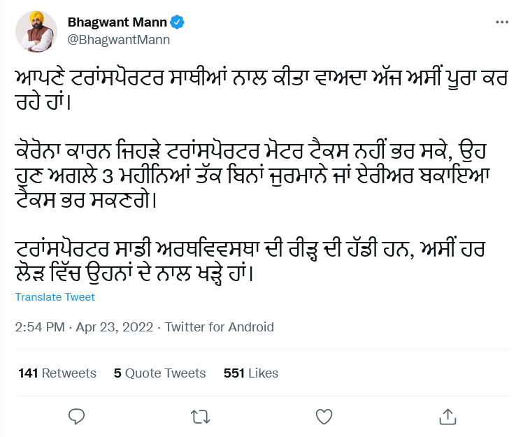 ਪੰਜੱਬ ਸਰਕਾਰ ਨੇ ਪੰਜਾਬ ਦੇ ਟਰਾਂਸਪੋਰਟਰਾਂ ਲਈ ਐਲਾਨ ਕੀਤਾ ਹੈ ਕਿ ਜਿਹੜੇ ਲੋਕ ਕੋਰੋਨਾ ਕਾਰਨ ਆਪਣਾ ਟੈਕਸ ਨਹੀਂ ਭਰ ਸਕੇ ਉਹ ਬਿਨਾਂ ਕਿਸੇ ਜ਼ੁਰਮਾਨੇ ਅਤੇ ਬਕਾਏ ਤੋਂ ਮੋਟਰ ਟੈਕਸ ਅਦਾ ਕਰ ਸਕਦੇ ਹਨ। ਸੀਐਮ ਭਗਵੰਤ ਮਾਨ ਨੇ ਐਲਾਨ ਕਰਦਿਆਂ ਕਿਹਾ ਹੈ ਕਿ ਵੱਡੀ ਗਿਣਤੀ ਵਿੱਚ ਜਿਹੜੇ ਲੋਕ ਕੋਰੋਨਾ ਕਾਰਨ ਆਪਣਾ ਟੈਕਸ ਨਹੀਂ ਭਰ ਸਕੇ, ਉਨ੍ਹਾਂ ਨੂੰ ਇਸ ਸਕੀਮ ਤਹਿਤ ਬਿਨਾਂ ਕਿਸੇ ਜ਼ੁਰਮਾਨੇ ਅਤੇ ਬਕਾਏ ਤੋਂ ਮੋਟਰ ਟੈਕਸ ਅਦਾ ਕਰਨ ਦਾ ਮੌਕਾ ਮਿਲੇਗਾ। ਮੁੱਖ ਮੰਤਰੀ ਨੇ ਕਿਹਾ ਕਿ ਟਰਾਂਸਪੋਰਟਰ ਸਾਡੀ ਅਰਥਵਿਵਸਥਾ ਦੀ ਰੀੜ੍ਹ ਦੀ ਹੱਡੀ ਹਨ, ਅਸੀਂ ਹਰ ਲੋੜ ਵਿੱਚ ਉਹਨਾਂ ਦੇ ਨਾਲ ਖੜ੍ਹੇ ਹਾਂ। ਇਸ ਐਮਨੈਸਟੀ ਸਕੀਮ ਨਾਲ ਜਿੱਥੇ ਇੱਕ ਪਾਸੇ ਉਨ੍ਹਾਂ ਟਰਾਂਸਪੋਰਟਰਾਂ ਨੂੰ ਰਾਹਤ ਮਿਲੇਗੀ, ਜੋ ਜ਼ੁਰਮਾਨੇ ਕਾਰਨ ਟੈਕਸ ਅਦਾ ਨਹੀਂ ਕਰ ਪਾ ਰਹੇ ਸਨ, ਉਥੇ ਹੀ ਇਸ ਨਾਲ ਸਰਕਾਰੀ ਖਜ਼ਾਨੇ ਨੂੰ ਵੀ ਕਾਫੀ ਮਦਦ ਮਿਲੇਗੀ। ਐਮਨੈਸਟੀ ਸਕੀਮ ਦਾ ਐਲਾਨ 25-4-2022 ਤੋਂ 24-07-2022 ਤੱਕ ਤਿੰਨ ਮਹੀਨਿਆਂ ਲਈ ਕੀਤਾ ਜਾਵੇਗਾ। ਇਸ ਘੋਸ਼ਣਾ ਵਿੱਚ ਹੁਣ ਤੱਕ ਜਿੰਨ੍ਹਾਂ ਟਰਾਂਸਪੋਰਟਰਾਂ ਨੇ ਟੈਕਸ ਨਹੀਂ ਭਰਿਆ ਹੈ, ਉਨ੍ਹਾਂ ਨੂੰ ਬਿਨਾਂ ਜੁਰਮਾਨੇ ਦੇ ਟੈਕਸ ਭਰਨ ਦਾ ਇੱਕ ਹੋਰ ਮੌਕਾ ਦਿੱਤਾ ਜਾਵੇਗਾ।