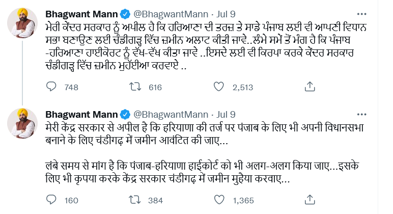 ਜੈਪੁਰ ਵਿੱਚ ਉੱਤਰੀ ਜ਼ੋਨ ਕੌਂਸਲ ਦੀ ਮੀਟਿੰਗ ਵਿੱਚ ਕੇਂਦਰੀ ਗ੍ਰਹਿ ਮੰਤਰੀ ਅਮਿਤ ਸ਼ਾਹ ਨੇ ਵਿਧਾਨ ਸਭਾ ਵਿੱਚ ਹਰਿਆਣਾ ਨੂੰ ਜ਼ਮੀਨ ਦੇਣ ਦਾ ਐਲਾਨ ਕੀਤਾ ਸੀ। ਇਸ ਤੋਂ ਬਾਅਦ ਮੁੱਖ ਮੰਤਰੀ ਭਗਵੰਤ ਮਾਨ ਨੇ ਟਵੀਟ ਕਰਕੇ ਪੰਜਾਬ ਲਈ ਵੱਖਰੀ ਵਿਧਾਨ ਸਭਾ ਅਤੇ ਹਾਈ ਕੋਰਟ ਲਈ ਜ਼ਮੀਨ ਦੇਣ ਦੀ ਮੰਗ ਵੀ ਉਠਾਈ। ਮੁੱਖ ਮੰਤਰੀ ਦੇ ਇਸ ਟਵੀਟ ਨੂੰ ਚੰਡੀਗੜ੍ਹ ‘ਤੇ ਪੰਜਾਬ ਦੇ ਅਧਿਕਾਰਾਂ ਨੂੰ ਸਮਰਪਣ ਵਜੋਂ ਦੇਖਿਆ ਜਾ ਰਿਹਾ ਹੈ।