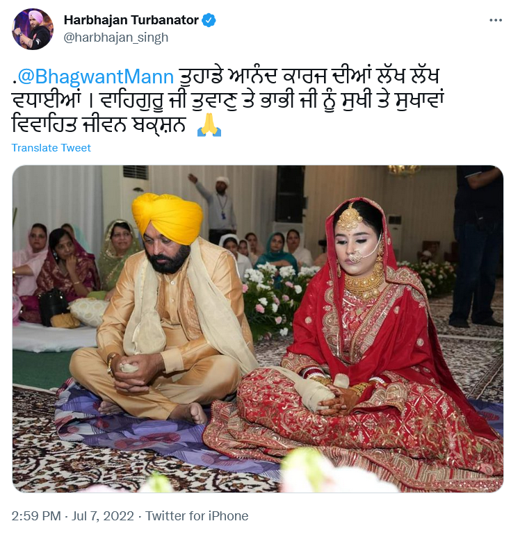 ਮੁੱਖ ਮੰਤਰੀ ਭਗਵੰਤ ਮਾਨ ਨੂੰ ਵਿਆਹ ਦੀ ਵਧਾਈ ਦੇਣ ਲਈ ਟਵੀਟ ‘ਚ ਗ਼ਲਤ ਪੰਜਾਬੀ ਲਿਖਣ ਨੂੰ ਲੈ ਕੇ ਕ੍ਰਿਕਟਰ ਤੇ ਰਾਜ ਸਭਾ ਮੈਂਬਰ ਹਰਭਜਨ ਸਿੰਘ ਟ੍ਰੋਲ ਹੋ ਰਹੇ ਹਨ। ਲੋਕਾਂ ਨੇ ਵੱਖ-ਵੱਖ ਤਰ੍ਹਾਂ ਨਾਲ ਹਰਭਜਨ ਸਿੰਘ ਦੇ ਇਸ ਟਵੀਟ ‘ਤੇ ਪ੍ਰਤੀਕਿਰਿਆਵਾਂ ਦਿੱਤੀਆਂ ਹਨ। ਹਰਭਜਨ ਸਿੰਘ ਨੇ ਆਪਣੇ ਟਵੀਟ ‘ਚ ਮੁੱਖ ਮੰਤਰੀ ਭਗਵੰਤ ਮਾਨ ਤੇ ਡਾ. ਗੁਰਪ੍ਰੀਤ ਕੌਰ ਨੂੰ ਵਿਆਹ ਦੀ ਵਧਾਈ ਦਿੰਦਿਆਂ ਲਿਖਿਆ ਹੈ, ”@BhagwantMann ਤੁਹਾਡੇ ਆਨੰਦ ਕਾਰਜ ਦੀਆਂ ਲੱਖ-ਲੱਖ ਵਧਾਈਆਂ। ਵਾਹਿਗੁਰੂ ਜੀ ਤੁਵਾਣੁ ਤੇ ਭਾਭੀ ਜੀ ਨੂੰ ਸੁਖੀ ਤੇ ਸੁਖਾਵਾਂ ਵਿਵਾਹਤ ਜੀਵਨ ਬਕਸ਼ਨ”। ਇਸ ਟਵੀਟ ‘ਚ ਗ਼ਲਤ ਪੰਜਾਬੀ ਲਿਖਣ ਕਾਰਨ ਲੋਕਾਂ ਵੱਲੋਂ ਉਨ੍ਹਾਂ ਨੂੰ ਕਾਫ਼ੀ ਟ੍ਰੋਲ ਕੀਤਾ ਜਾ ਰਿਹਾ ਹੈ। ਹਰਭਜਨ ਸਿੰਘ ਵੱਲੋਂ ਟਵੀਟ ‘ਚ ਪੰਜਾਬੀ ਦੇ ਸ਼ਬਦ ਗ਼ਲਤ ਲਿਖਣ ‘ਤੇ ਕੁਝ ਲੋਕਾਂ ਵੱਲੋਂ ਉਨ੍ਹਾਂ ਨੂੰ ਟ੍ਰੋਲ ਕੀਤਾ ਜਾ ਰਿਹਾ ਹੈ।