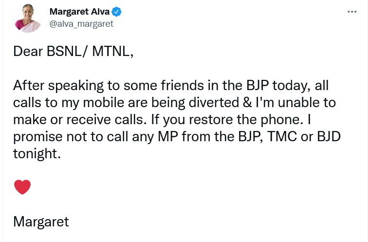 ਵਿਰੋਧੀ ਧਿਰ ਦੀ ਉਪ ਰਾਸ਼ਟਰਪਤੀ ਅਹੁਦੇ ਦੀ ਉਮੀਦਵਾਰ ਮਾਰਗਰੇਟ ਅਲਵਾ ਨੇ ਦਾਅਵਾ ਕੀਤਾ ਕਿ ਭਾਜਪਾ ਦੇ ਕੁਝ ਨੇਤਾਵਾਂ ਨਾਲ ਗੱਲ ਕਰਨ ਤੋਂ ਬਾਅਦ ਉਨ੍ਹਾਂ ਦੀਆਂ ਸਾਰੀਆਂ ਕਾਲਾਂ ਮੋੜ ਦਿੱਤੀਆਂ ਗਈਆਂ (Divert) ਹਨ। ਉਹ ਨਾ ਤਾਂ ਕਿਸੇ ਨੂੰ ਕਾਲ ਕਰ ਸਕਦੇ ਹੈ ਅਤੇ ਨਾ ਹੀ ਕਿਸੇ ਵਲੋਂ ਕਾਲ ਪ੍ਰਾਪਤ ਕਰ ਸਕਦੀ ਹੈ। ਇਸ ਦੇ ਨਾਲ ਹੀ, ਉਨ੍ਹਾਂ ਨੇ ਬੀਐਸਐਨਐਲ ਅਤੇ ਐਮਟੀਐਨਐਲ ਨੂੰ ਟੈਗ ਕਰਦਿਆਂ ਟਵੀਟ ਕੀਤਾ ਜਿਸ ਵਿਚ ਲਿਖਿਆ ਕਿ ਜੇਕਰ ਸੇਵਾਵਾਂ ਦੁਬਾਰਾ ਬਹਾਲ ਹੁੰਦੀਆਂ ਹਨ ਤਾਂ ਉਹ ਭਾਜਪਾ, ਤ੍ਰਿਣਮੂਲ, ਕਾਂਗਰਸ ਜਾਂ ਬੀਜਦ ਦੇ ਕਿਸੇ ਵੀ ਸੰਸਦ ਮੈਂਬਰ ਨੂੰ ਨਹੀਂ ਬੁਲਾਏਗੀ। ਅਲਵਾ ਨੇ ਟੈਲੀਕਾਮ ਕੰਪਨੀ ਮਹਾਨਗਰ ਟੈਲੀਫੋਨ ਨਿਗਮ ਲਿਮਿਟੇਡ (MTNL) ਨੂੰ ਟਵਿੱਟਰ ‘ਤੇ ਦੱਸਿਆ ਕਿ ਉਸ ਦਾ MTNL Know Your Customer (KYC) ਮੁਅੱਤਲ ਕਰ ਦਿੱਤਾ ਗਿਆ ਹੈ ਅਤੇ ਉਨ੍ਹਾਂ ਦਾ ਸਿਮ ਕਾਰਡ 24 ਘੰਟਿਆਂ ਲਈ ਬਲਾਕ ਰਹੇਗਾ। ਉਸਨੇ ਕੰਪਨੀ ਨੂੰ ਪੁੱਛਿਆ ਕਿ ਕੀ ਤੁਹਾਨੂੰ ਹੁਣ ਮੇਰੇ ਕੇਵਾਈਸੀ ਦੀ ਲੋੜ ਹੈ? ਦੱਸ ਦੇਈਏ ਕਿ ਮਾਰਗਰੇਟ ਅਲਵਾ ਵਿਰੋਧੀ ਧਿਰ ਦੀ ਉਪ ਰਾਸ਼ਟਰਪਤੀ ਅਹੁਦੇ ਦੀ ਉਮੀਦਵਾਰ ਹਨ ਅਤੇ ਇਸ ਸਮੇਂ ਉਹ ਚੋਣਾਂ ‘ਚ ਜਿੱਤ ਲਈ ਸਮਰਥਨ ਲੈਣ ਦੀ ਕੋਸ਼ਿਸ਼ ਕਰ ਰਹੇ ਹਨ। ਉਹ ਰੋਜ਼ਾਨਾ ਕਈ ਮੁੱਖ ਮੰਤਰੀਆਂ ਅਤੇ ਸੰਸਦ ਮੈਂਬਰਾਂ ਨੂੰ ਮਿਲ ਰਹੇ ਹਨ। ਸ਼ਨੀਵਾਰ ਨੂੰ ਉਨ੍ਹਾਂ ਨੇ ਭਾਜਪਾ ਸ਼ਾਸਿਤ ਕਰਨਾਟਕ ਅਤੇ ਅਸਾਮ ਦੇ ਮੁੱਖ ਮੰਤਰੀਆਂ ਨਾਲ ਵੀ ਗੱਲਬਾਤ ਕੀਤੀ। ਉਨ੍ਹਾਂ ਨੇ ਦਿੱਲੀ ਦੇ ਮੁੱਖ ਮੰਤਰੀ ਅਰਵਿੰਦ ਕੇਜਰੀਵਾਲ ਤੋਂ ਵੀ ਸਮਰਥਨ ਮੰਗਿਆ ਹੈ।