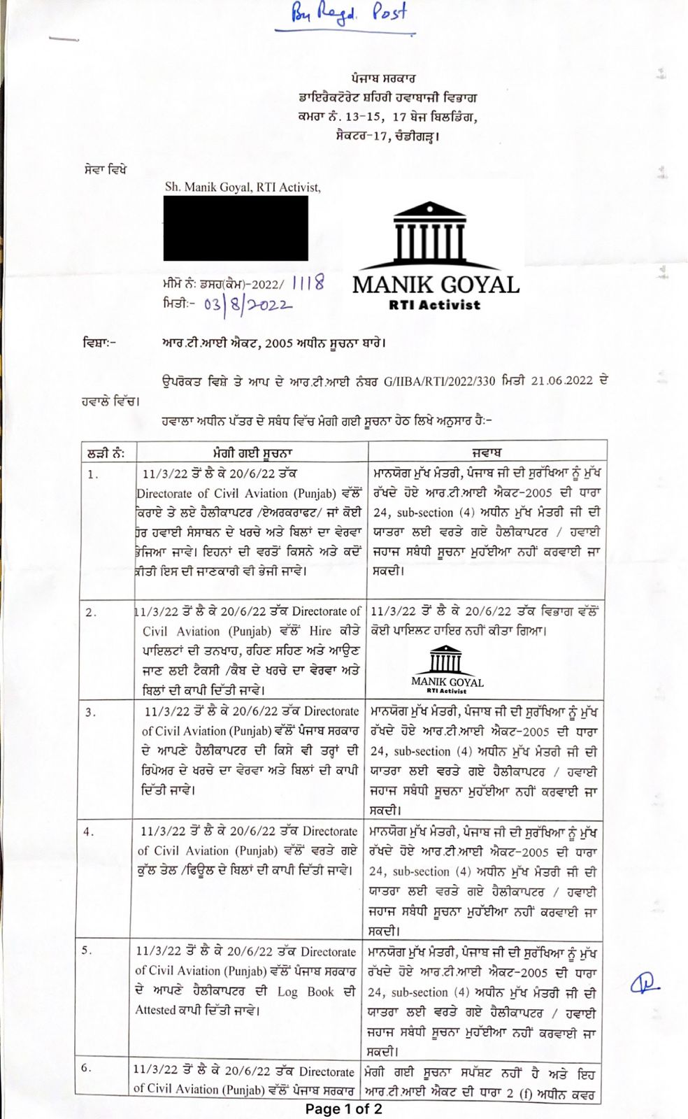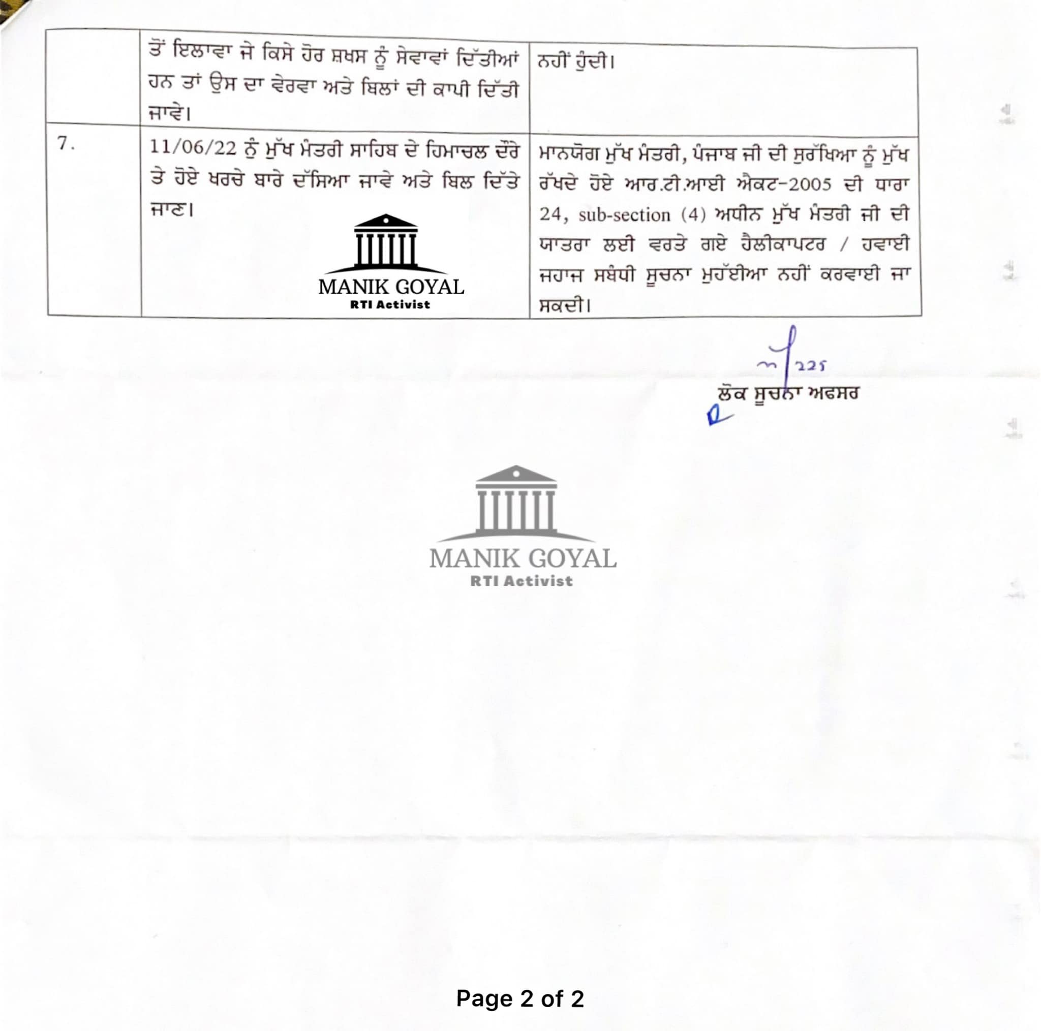 ਆਰਟੀਆਈ ਕਾਰਕੁੰਨ ਮਾਨਿਕ ਗੋਇਲ ਨੇ ਕਿਹਾ ਹੈ ਕਿ ਪਾਰਦਰਸ਼ਿਤਾ ਦੀ ਗੱਲ ਕਰਨ ਵਾਲੀ ਆਮ ਆਦਮੀ ਪਾਰਟੀ ਮੁੱਖ ਮੰਤਰੀ ਦੇ ਹਫਾਈ ਸਫਰ ਦੇ ਖਰਚੇ ਨੂੰ ਦੱਸਣ ਤੋਂ ਨਾਂਹ ਕਰ ਦਿੱਤੀ ਹੈ । ਉਨ੍ਹਾਂ ਕਿਹਾ “ਸੁਰੱਖਿਆ ਦਾ ਬਹਾਣਾ ਬਣਾ ਕੇ ਹਵਾਈ ਯਾਤਰਾ ਦਾ ਖਰਚਾ ਦੱਸਣ ਤੋਂ ਇਨਕਾਰ ਕੀਤਾ ਗਿਆ ਹੈ । ਜਿਹੜੀ ਯਾਤਰਾ ਹੋ ਗਈ ਉਸਦੇ ਖਰਚੇ ਜੋ ਜਨਤਾ ਦੀ ਜੇਭ ਚੋ ਕੀਤੇ ਗਏ ਹਨ, ਉਹਨਾਂ ਨੂੰ ਦੱਸਣ ਨਾਲ ਸੁਰੱਖਿਆ ਵਿੱਚ ਕੀ ਦਿੱਕਤ ਹੋ ਸਕਦੀ ਹੈ ?” “ਹੈਲੀਕਾਪਟਰ ਦੀ ਰਿਪੇਅਰ ਦਾ ਖਰਚਾ ਦੱਸਣ ਨਾਲ ਸੁਰੱਖਿਆ ਵਿੱਚ ਕਿਵੇਂ ਦਿੱਕਤ ਹੋ ਸਕਦੀ ਹੈ?- ਹੈਲੀਕਾਪਟਰ ਦੇ ਤੇਲ ਦਾ ਖਰਚਾ ਦੱਸਣ ਨਾਲ ਸੁਰੱਖਿਆ ਵਿੱਚ ਕਿਵੇਂ ਦਿੱਕਤ ਹੋ ਸਕਦੀ ਹੈ?” ਉਨ੍ਹਾਂ ਕਿਹਾ ਕਿ “ਦਰਅਸਲ ਮੁੱਖਮੰਤਰੀ ਸਾਹਬ ਨੇ ਸਰਕਾਰੀ ਹੈਲੀਕਾਪਟਰ ਦੀ ਰੇਲ ਬਣਾ ਰੱਖੀ ਹੈ, ਹਰ ਰੋਜ ਕਿੰਨੇ ਕਿੰਨੇ ਵਾਰ ਚੜਦਾ ਇਹ। ਇਸਤੋਂ ਇਲਾਵਾ ਦਿੱਲੀ ਵਾਲੀ ਲੀਡਰਸ਼ਿਪ ਨਾਲ ਪ੍ਰਾਈਵੇਟ ਜੈੱਟ ਕਰਾਏ ਤੇ ਲੈ ਕੇ ਹੋਰ ਸੂਬਿਆਂ ਵਿੱਚ ਗੈੜੇ ਲਗਾਏ ਜਾ ਰਹੇ ਹਨ ਜਿਸਦਾ ਖਰਚਾ ਰੋਜ ਦਾ ਕਰੋੜਾਂ ਦਾ ਹੈ। ਇਸ ਲਈ ਦੱਸਣ ਤੋਂ ਪਿੱਛੇ ਹਟ ਰਹੇ ਹਨ। ਇਹ ਲੋਕਾਂ ਦਾ ਪੈਸਾ ਹੈ , ਇਹ ਸਰਕਾਰ ਨੂੰ ਦੱਸਣਾ ਹੀ ਪਵੇਗਾ। ਇਹ ਖਰਚੇ ਜੋ ਪਹਿਲਾਂ ਵਾਲੀਆਂ ਸਰਕਾਰਾਂ ਨੇ ਨਹੀਂ ਲੁਕੋਏ ਉਹ ਆਮ ਆਦਮੀ ਪਾਰਟੀ ਦੀ ਸਰਕਾਰ ਨੇ ਕਰ ਦਿੱਤਾ ਹੈ। ਇਹੀ ਬਦਲਾਅ ਹੈ ਤੇ ਦਿੱਲੀ ਮਾਡਲ ਹੈ।”