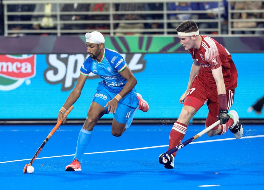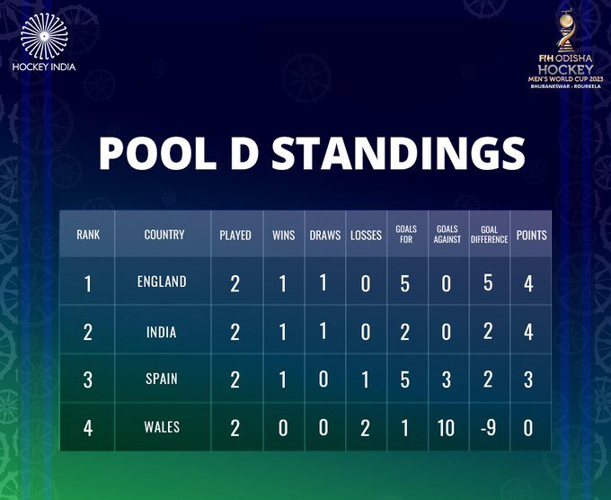 ਪੁਰਸ਼ ਹਾਕੀ ਵਿਸ਼ਵ ਕੱਪ-2023 ਵਿੱਚ ਭਾਰਤ ਤੇ ਇੰਗਲੈਂਡ ਵਿਚਾਲੇ ਖੇਡਿਆ ਪੂਲ ਡੀ ਦਾ ਦੂਜਾ ਮੁਕਾਬਲਾ ਗੋਲਰਹਿਤ ਡਰਾਅ ਰਿਹਾ। ਮੈਚ ਬੇਨਤੀਜਾ ਰਹਿਣ ਕਰਕੇ ਭਾਰਤ ਦੀਆਂ ਕੁਆਰਟਰ ਫਾਈਨਲ ਗੇੜ ਵਿੱਚ ਸਿੱਧਾ ਦਾਖਲਾ ਪਾਉਣ ਦੀਆਂ ਸੰਭਾਵਨਾਵਾਂ ਅਜੇ ਵੀ ਬਰਕਰਾਰ ਹਨ। ਭਾਰਤ ਆਪਣਾ ਅਗਲਾ ਮੁਕਾਬਲਾ ਵੇਲਸ ਖਿਲਾਫ਼ 19 ਜਨਵਰੀ ਨੂੰ ਖੇਡੇਗਾ। ਬਿਰਸਾ ਮੁੰਡਾ ਸਟੇਡੀਅਮ ਰੁੜਕੇਲਾ ਵਿੱਚ ਖੇਡੇ ਮੁਕਾਬਲੇ ਦੌਰਾਨ ਦੋਵੇਂ ਟੀਮਾਂ ਮੈਦਾਨ ’ਤੇ ਚੰਗੀ ਖੇਡ ਵਿਖਾਉਣ ਦੇ ਬਾਵਜੂਦ ਗੋਲ ਕਰਨ ਵਿਚ ਨਾਕਾਮ ਰਹੀਆਂ। ਇੰਗਲੈਂਡ ਨੂੰ ਜਿੱਥੇ ਪੂਰੇ ਮੈਚ ਦੌਰਾਨ ਅੱਠ ਪੈਨਲਟੀ ਕਾਰਨਰ ਮਿਲੇ, ਉਥੇ ਮੇਜ਼ਬਾਨ ਟੀਮ ਦੇ ਹਿੱਸੇ ਚਾਰ ਆੲੇ। ਦੋਵਾਂ ਟੀਮਾਂ ਦੇ ਦੋ ਦੋ ਮੈਚਾਂ ਤੋਂ ਹੁਣ ਚਾਰ-ਚਾਰ ਅੰਕ ਹਨ। ਕੁਆਰਟਰ ਫਾਈਨਲਜ਼ ਲਈ ਥਾਂ ਪੱਕੀ ਕਰਨ ਬਾਰੇ ਫੈਸਲਾ 19 ਜਨਵਰੀ ਨੂੰ ਹੋਵੇਗਾ ਜਦੋਂ ਭਾਰਤ ਦਾ ਮੁਕਾਬਲਾ ਵੇਲਸ ਨਾਲ ਹੋਵੇਗਾ ਜਦੋਂਕਿ ਇੰਗਲੈਂਡ ਤੇ ਸਪੇਨ ਇਕ ਦੂਜੇ ਦੇ ਸਾਹਮਣੇ ਹੋਣਗੇ। ਦੋਵੇਂ ਮੈਚ ਭੁਬਨੇਸ਼ਵਰ ਦੇ ਕਲਿੰਗਾ ਸਟੇਡੀਅਮ ਵਿੱਚ ਖੇਡੇ ਜਾਣਗੇ।