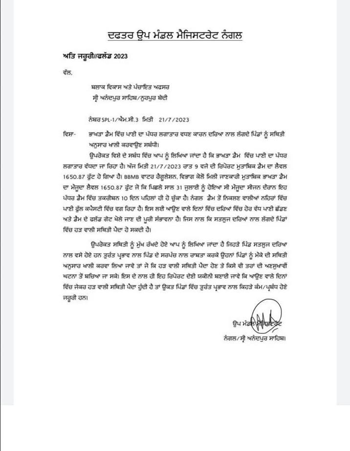 ਸ਼ੁੱਕਰਵਾਰ ਰਾਤ ਤੋਂ ਲਗਾਤਾਰ ਮੀਂਹ ਪੈਣ ਕਾਰਨ ਭਾਖੜਾ ‘ਚ ਪਾਣੀ ਦਾ ਪੱਧਰ ਵੱਧ ਕੇ 1650.87 ਫੁੱਟ ਹੋ ਗਿੱਆ ਹੈ। ਨੰਗਲ ਡੈਮ ਤੋਂ ਨਿਕਲਣ ਵਾਲੀਆਂ ਸਾਰੀਆਂ ਨਹਿਰਾਂ ਫੁੱਲ ਕੈਪਿਸਟੀ ‘ਚ ਵਹਿ ਰਹੀਆਂ ਹਨ। ਐਸਡੀਐਮ ਨੇ ਕਿਹਾ ਹੈ ਕਿ ਆਉਣ ਵਾਲੇ ਦਿਨਾਂ ‘ਚ ਫਲੱਡ ਗੇਟ ਖੋਲੇ ਜਾ ਸਕਦੇ ਹੈ ਅਤੇ ਭਾਖੜਾ ਡੈਮ ਵਿਚੋਂ ਪਾਣੀ ਛੱਡਣ ਦੀ ਹੈ ਪੂਰੀ ਸੰਭਾਵਨਾ ਹੈ, ਜਿਸ ਕਾਰਨ ਸੂਬੇ ਵਿੱਚ ਮੁੜ ਹੜ੍ਹ ਆ ਸਕਦੇ ਹਨ। ਮੌਸਮ ਵਿਭਾਗ ਦੇ ਅਲਰਟ ਕਾਰਨ ਸਬੰਧਤ ਜ਼ਿਲ੍ਹਿਆਂ ਦੀਆਂ ਟੀਮਾਂ ਰਾਵੀ, ਬਿਆਸ, ਸਤਲੁਜ ਅਤੇ ਘੱਗਰ ਦੇ ਆਸ-ਪਾਸ ਦੇ ਇਲਾਕਿਆਂ ਦੀ ਨਿਗਰਾਨੀ ਕਰ ਰਹੀਆਂ ਹਨ। ਮੌਸਮ ਵਿਭਾਗ ਵੱਲੋਂ ਜਾਰੀ ਅੰਕੜਿਆਂ ਅਨੁਸਾਰ 22 ਤੋਂ 24 ਜੁਲਾਈ ਤੱਕ ਸੂਬੇ ਦੇ ਵੱਖ-ਵੱਖ ਇਲਾਕਿਆਂ ‘ਚ ਗਰਜ ਨਾਲ ਮੀਂਹ ਪੈ ਸਕਦਾ ਹੈ।![]()