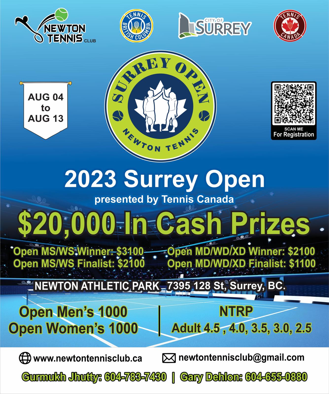 ਨਿਊਟਨ ਟੈਨਿਸ ਵੱਲੋਂ ਸਰੀ ਵਿੱਚ 4 ਅਗਸਤ ਤੋਂ 13 ਅਗਸਤ ਤੱਕ ਸਰੀ ਓਪਨ ਟੈਨਿਸ ਟੂਰਨਾਮੈਂਟ 2023 ਕਰਵਾਇਆ ਜਾ ਰਿਹਾ ਹੈ । ਜਿਸ ਵਿੱਚ ਪਹਿਲਾ ਇਨਾਮ OPEN MS/WS WINNER $ 3100, OPEN MS/WS FINALIST $2100 , OPEN MD/WD/XD WINNER $2100, OPENMD/WE/XD $1100 ਦਿੱਤਾ ਜਾਵੇਗਾ । ਟੂਰਨਾਂਮੈਂਟ Newton Athletic Park 7395 128 St, surrey , BC ਵਿੱਚ ਖੇਡਿਆ ਜਾ ਰਿਹਾ ਹੈ । ਹੋਰ ਕਿਸੇ ਵੀ ਜਾਣਕਾਰੀ ਲਈ Gurmukh Jhutty (604.783.7430) & Gary Dehlon (604.655.0880) ਨਾਲ ਸੰਪਰਕ ਕੀਤਾ ਜਾ ਸਕਦਾ ਹੈ ।