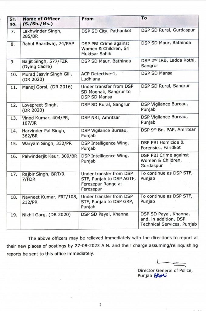 ਪੰਜਾਬ ਸਰਕਾਰ ਵਲੋਂ ਰਾਜ ਵਿੱਚ 19 ਡੀਐੱਸਪੀਜ਼ ਦੇ ਤਬਾਦਲੇ ਕੀਤੇ ਹਨ। ਬਦਲੇ ਅਧਿਕਾਰੀਆਂ ਵਿਚ ਮੌੜ ਮੰਡੀ ਦੇ 30 ਹਜ਼ਾਰ ਰੁਪਏ ਕਥਿਤ ਰਿਸ਼ਵਤ ਲੈਣ ਵਾਲੇ ਬਲਜੀਤ ਸਿੰਘ ਬਰਾੜ ਦੀ ਥਾਂ ਰਾਹੁਲ ਭਾਰਦਵਾਜ ਨੂੰ ਸ੍ਰੀ ਮੁਕਤਸਰ ਸਾਹਿਬ ਤੋਂ ਬਦਲ ਕੇ ਲਾਇਆ ਗਿਆ ਹੈ। ਇਸੇ ਤਰ੍ਹਾਂ ਮਾਨਸਾ ਦੇ ਕੁੱਝ ਦਿਨ ਪਹਿਲਾਂ ਹੀ ਆਏ ਡੀਐੱਸਪੀ ਮਨੌਜ ਗੌਰਸੀ ਨੂੰ ਬਦਲਕੇ ਸਬ ਡਵੀਜ਼ਨ ਸੰਗਰੂਰ ਰੂਰਲ ਲਾਇਆ ਗਿਆ ਹੈ, ਜਦੋਂ ਕਿ ਉਨ੍ਹਾਂ ਦੀ ਥਾਂ ਮਾਨਸਾ ਵਿਖੇ ਜਸਵੀਰ ਸਿੰਘ ਗਿੱਲ ਨੂੰ ਤਾਇਨਾਤ ਕੀਤਾ ਗਿਆ ਹੈ।