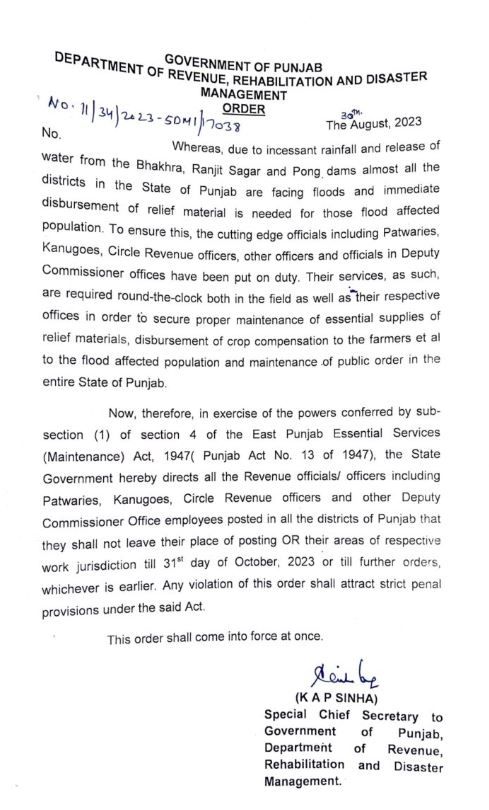 ਪੰਜਾਬ ਸਰਕਾਰ ਨੇ ਸੂਬੇ ਵਿਚ 31 ਅਕਤੂਬਰ ਤੱਕ ਐਸਮਾ (ਈਸਟ ਪੰਜਾਬ ਅਸੈਂਸ਼ੀਅਲ ਸਰਵਸਿਜ਼ ਮੈਂਟੇਨੈਂਸ ਐਕਟ) ਲਾਗੂ ਕਰ ਦਿੱਤਾ ਹੈ। ਸਰਕਾਰ ਨੇ ਕਿਹਾ ਕਿ ਐਕਟ ਵਿਚਲੀਆਂ ਵਿਵਸਥਾਵਾਂ ਦੀ ਉਲੰਘਣਾ ਲਈ ਸਖ਼ਤ ਕਾਰਵਾਈ ਕੀਤੀ ਜਾਵੇਗੀ। ਹੁਕਮਾਂ ਤਹਿਤ ਪੰਜਾਬ ਦੇ ਸਾਰੇ ਜ਼ਿਲ੍ਹਿਆਂ ਵਿੱਚ ਤਾਇਨਾਤ ਪਟਵਾਰੀ, ਕਾਨੂੰਗੋ, ਸਰਕਲ ਮਾਲ ਅਫ਼ਸਰ ਤੇ ਡੀਸੀ ਦਫ਼ਤਰਾਂ ਦੇ ਸਾਰੇ ਮੁਲਾਜ਼ਮਾਂ ਨੂੰ ਸਟੇਸ਼ਨ ਨਾ ਛੱਡਣ ਦੀ ਤਾਕੀਦ ਕੀਤੀ ਗਈ ਹੈ। ਰੈਵੇਨਿਊ ਕਾਨੂੰਨਗੋ ਐਸੋਸੀਏਸ਼ਨ ਤੇ ਦਿ ਰੈਵੀਨਿਊ ਪਟਵਾਰ ਯੂਨੀਅਨ ਪੰਜਾਬ ਨੇ ਸੂਬੇ ਵਿੱਚ 1 ਸਤੰਬਰ ਤੋਂ ਅਣਮਿੱਥੇ ਸਮੇਂ ਲਈ ‘ਕਲਮ ਛੋੜ’ ਹੜਤਾਲ ’ਤੇ ਜਾਣ ਦਾ ਐਲਾਨ ਕੀਤਾ ਸੀ। ਦੋਵਾਂ ਐਸੋਸੀਏਸ਼ਨਾਂ ਦੇ ਮੈਂਬਰਾਂ ਨੇ ਦਾਅਵਾ ਕੀਤਾ ਸੀ ਪਿਛਲੇ ਦਿਨੀਂ ਜ਼ਿਲ੍ਹਾ ਸੰਗਰੂਰ ’ਚ ਪਟਵਾਰੀ, ਕਾਨੂੰਨਗੋ ਤੇ ਤਹਿਸੀਲਦਾਰ ਖਿਲਾਫ਼ ਝੂਠਾ ਕੇਸ ਦਰਜ ਕੀਤਾ ਗਿਆ ਹੈ। ਐਸੋਸੀਏਸ਼ਨਾਂ ਨੇ ਇਸ ਮਾਮਲੇ ਨੂੰ ਰੱਦ ਕਰਨ ਦੀ ਮੰਗ ਕੀਤੀ ਸੀ। ਉਧਰ ਡੀਸੀ ਦਫ਼ਤਰ ਕਰਮਚਾਰੀ ਐਸੋਸੀਏਸ਼ਨ ਨੇ 11 ਤੋਂ 13 ਸਤੰਬਰ ਤੱਕ ‘ਕਲਮ ਛੋੜ’ ਹੜਤਾਲ ਦਾ ਵੱਖਰੇ ਤੌਰ ’ਤੇ ਐਲਾਨ ਕੀਤਾ ਹੋਇਆ ਹੈ।