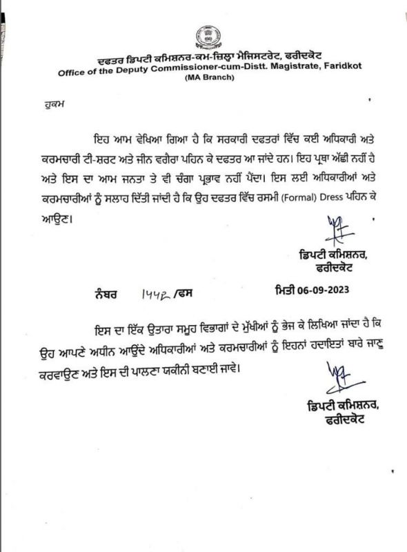 ਫਰੀਦਕੋਟ ਦੇ ਡਿਪਟੀ ਕਮਿਸ਼ਨਰ ਵਿਨੀਤ ਕੁਮਾਰ ਨੇ ਇਕ ਦਫਤਰੀ ਹੁਕਮ ਜਾਰੀ ਕਰ ਕੇ ਦਫਤਰਾਂ ਵਿਚ ਜੀਨਸ ਤੇ ਟੀ ਸ਼ਰਟ ਪਾ ਕੇ ਆਉਣ ’ਤੇ ਪਾਬੰਦੀ ਲਗਾ ਦਿੱਤੀ ਹੈ। ਉਹਨਾਂ ਨੇ ਆਪਣੇ ਹੁਕਮ ਵਿਚ ਕਿਹਾ ਹੈ ਕਿ ਸਿਰਫ ਫਾਰਮਲ ਡਰੈਸ ਪਾ ਕੇ ਹੀ ਦਫਤਰ ਆਇਆ ਜਾਵੇ।