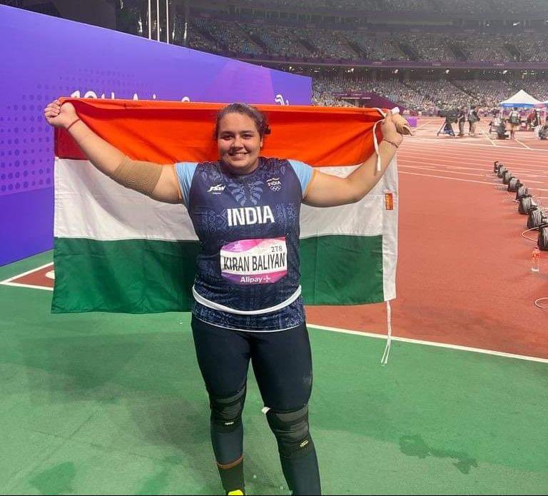 ਏਸ਼ੀਅਨ ਖੇਡਾਂ ਹਾਂਗਜ਼ੂ ਕਿਰਨ ਬਾਲਿਆਨ ਨੇ ਔਰਤਾਂ ਦੇ ਸ਼ਾਟਪੁੱਟ (ਗੋਲਾ ਸੁੱਟਣ) ਮੁਕਾਬਲੇ ’ਚ ਕਾਂਸੀ ਦਾ ਤਗ਼ਮਾ ਜਿੱਤ ਕੇ ਭਾਰਤ ਨੂੰ ਅਥਲੈਟਿਕਸ ਮੁਕਾਬਲਿਆਂ ’ਚ ਪਹਿਲਾ ਤਗ਼ਮਾ ਜਿਤਾਇਆ ਹੈ। ਮੁਕਾਬਲੇ ਦੌਰਾਨ ਕਿਰਨ (24) ਨੇ ਤੀਜੀ ਕੋਸ਼ਿਸ਼ ’ਚ 17.36 ਮੀਟਰ ਦੂਰ ਗੋਲਾ ਸੁੱਟਿਆ। ਇਸ ਮੁਕਾਬਲੇ ’ਚ ਇੱਕ ਹੋਰ ਭਾਰਤੀ ਖਿਡਾਰਨ ਮਨਪ੍ਰੀਤ ਕੌਰ ਪੰਜਵੇਂ ਸਥਾਨ ’ਤੇ ਰਹੀ। ਇਸੇ ਦੌਰਾਨ ਭਾਰਤੀ ਦੌੜਾਕ ਹਿਮਾਸ਼ੀ ਮਲਿਕ ਔਰਤਾਂ ਦੀ 400 ਮੀਟਰ ਦੌੜ ਦੀ ਤੀਜੀ ਹੀਟ ’ਚ 57.82 ਸਕਿੰਟ ਦੇ ਸਮੇਂ ਨਾਲ ਪੰਜਵੇਂ ਸਥਾਨ ’ਤੇ ਰਹੀ ਤੇ ਫਾਈਨਲ ਲਈ ਕੁਆਲੀਫਾਈ ਨਾ ਸਕੀ। ਜਦਕਿ ਇਸੇ ਮੁਕਾਬਲੇ ’ਚ ਐਸ਼ਵਰਿਆ ਮਿਸ਼ਰਾ ਨੇ ਦੂਜੀ ਹੀਟ ’ਚ 52.73 ਸਕਿੰਟ ਦਾ ਸਮਾਂ ਕੱਢਦਿਆਂ ਫਾਈਨਲ ਰਾਊਂਡ ਲਈ ਕੁਆਲੀਫਾਈ ਕਰ ਲਿਆ ਹੈ।