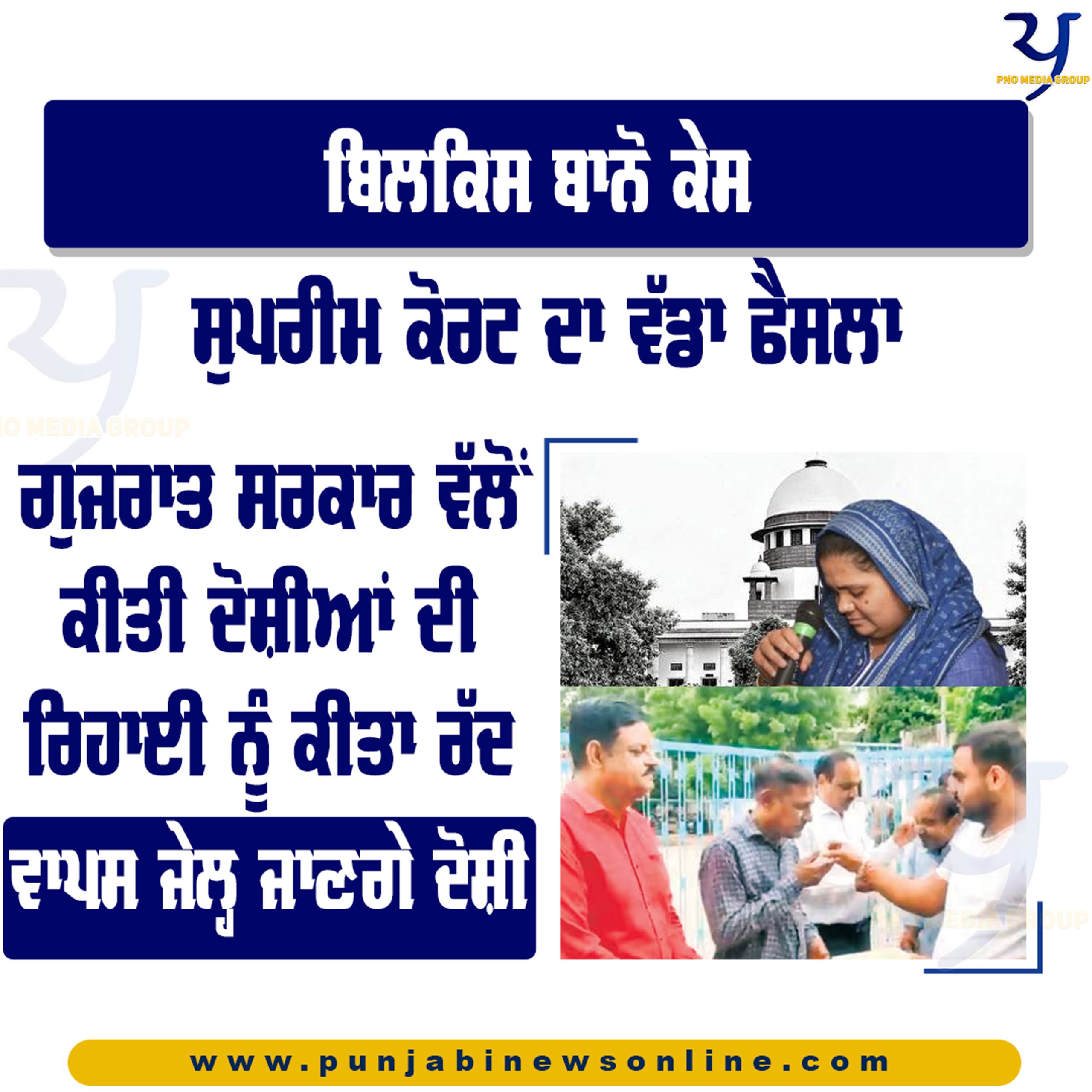 ਭਾਰਤੀ ਸੁਪਰੀਮ ਕੋਰਟ ਨੇ ਬਿਲਕਿਸ ਬਾਨੋਂ ਕੇਸ ਦੇ ਗੁਜਰਾਤ ਸਰਕਾਰ ਵੱਲੋਂ ਰਿਹਾਅ ਕੀਤੇ ਸਾਰੇ ਦੋਸ਼ੀਆਂ ਦੀ ਰਿਹਾਈ ਰੱਦ ਕਰ ਦਿੱਤੀ ਹੈ।ਜਿਸ ਤੋਂ ਬਾਅਦ ਇਹ ਸਾਰੇ ਦੋਸ਼ੀ ਹੁਣ ਵਾਪਸ ਜੇਲ੍ਹ ਜਾਣਗੇ।