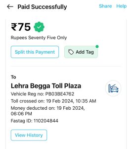 ਟੋਲ ਪਲਾਜ਼ੇ ਤੇ ਕਿਸਾਨ ਬੈਠੇ ਸਨ , ਧਰਨਾ ਚੱਲ ਰਿਹਾ ਸੀ , ਟੋਲ ਪਲਾਜਾ ਤੋਂ ਬੇਰੋਕ ਆਵਾਜਾਈ ਹੋ ਰਹੀ ਸੀ । ਪਰ ਸ਼ਾਮ ਨੂੰ ਫੋਨ ਤੇ ਮੈਸੇਜ ਆਇਆ ਕਿ ਟੋਲ ਪਲਾਜ਼ਾ ਤੇ ਟੋਲ ਟੈਕਸ ਕੱਟਿਆ ਗਿਆ । ਇੱਕ ਸਾਈਡ ਦੇ 75 ਰੁਪਏ ਕੱਟੇ ਹਨ । ਦੋਵੇ ਪਾਸਿਆਂ ਦੇ 75-75 ਰੁਪਏ ਆਨ ਲਾਈਨ ਵਸੂਲੇ ਗਏ ਹਨ। ਜਦਕਿ ਆਉਣ ਜਾਣ ਤੇ ਟੈਕਸ ਘੱਟ ਹੁੰਦਾ ਹੈ ਇੱਕ ਵਾਰ ਲੰਘਣ ਤੇ 75 ਰੁਪਏ ਸੀ ਅਐ ਵਾਪਸੀ ਤੇ 50 ਕੁ ਰੁਪਏ ਦੇ ਆਸਪਾਸ ਬਣਦਾ ਹੈ।