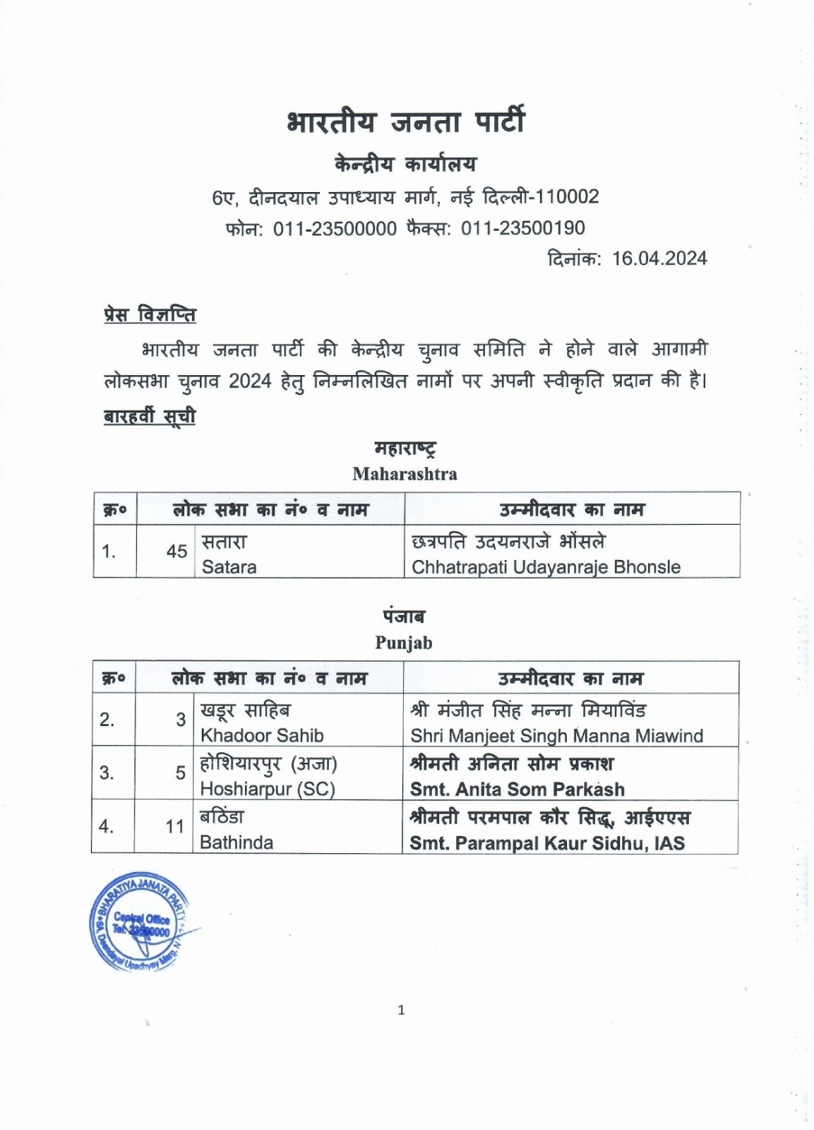 ਭਾਜਪਾ ਨੇ ਪੰਜਾਬ ਲਈ ਤਿੰਨ ਹੋਰ ਲੋਕ ਸਭਾ ਚੋਣਾਂ ਦਾ ਐਲਾਨ ਕਰ ਦਿੱਤਾ ਹੈ। ਬਠਿੰਡਾ ਤੋਂ ਪਰਮਪਾਲ ਕੌਰ, ਖਡੂਰ ਸਾਹਿਬ ਤੋਂ ਮਨਜੀਤ ਸਿੰਘ ਮੰਨਾ ਅਤੇ ਹੁਸਿਆਰਪੁਰ ਤੋਂ ਅਨਿਤਾ ਓਮ ਪ੍ਰਕਾਸ਼ ਨੂੰ ਭਾਜਪਾ ਨੇ ਉਮੀਦਵਾਰ ਬਣਾਇਆ ਹੈ।