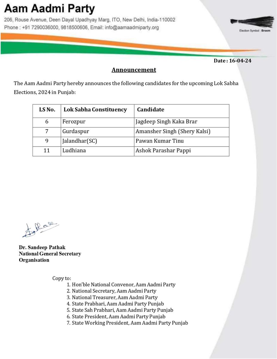 ਆਮ ਆਦਮੀ ਪਾਰਟੀ ਨੇ ਪੰਜਾਬ ਵਿੱਚ ਲੋਕ ਸਭਾ ਚੋਣਾਂ ਲਈ ਤੀਜੀ ਸੂਚੀ ਜਾਰੀ ਕਰ ਦਿੱਤੀ ਹੈ। ‘ਆਪ’ ਨੇ ਲੋਕ ਸਭਾ ਹਲਕਾ ਫਿਰੋਜ਼ਪੁਰ ਤੋਂ ਜਗਦੀਪ ਸਿੰਘ ਕਾਕਾ ਬਰਾੜ, ਗੁਰਦਾਸਪੁਰ ਤੋਂ ਅਮਨਪੁਰ ਸਿੰਘ ਸ਼ੈਰੀ ਕਲਸੀ, ਜਲੰਧਰ ਤੋਂ ਪਵਨ ਕੁਮਾਰ ਟੀਨੂ ਅਤੇ ਲੁਧਿਆਣਾ ਤੋਂ ਅਸ਼ੋਕ ਪਰਾਸ਼ਰ ਪੱਪੀ ਨੂੰ ਉਮੀਦਵਾਰ ਐਲਾਨ ਦਿੱਤਾ ਹੈ। ਆਮ ਆਦਮੀ ਪਾਰਟੀ ਨੇ ਹੁਣ ਪੰਜਾਬ ਦੀਆਂ ਸਾਰੀਆਂ 13 ਸੀਟਾਂ ਲਈ ਉਮੀਦਵਾਰਾਂ ਦਾ ਐਲਾਨ ਕਰ ਦਿੱਤਾ ਹੈ।