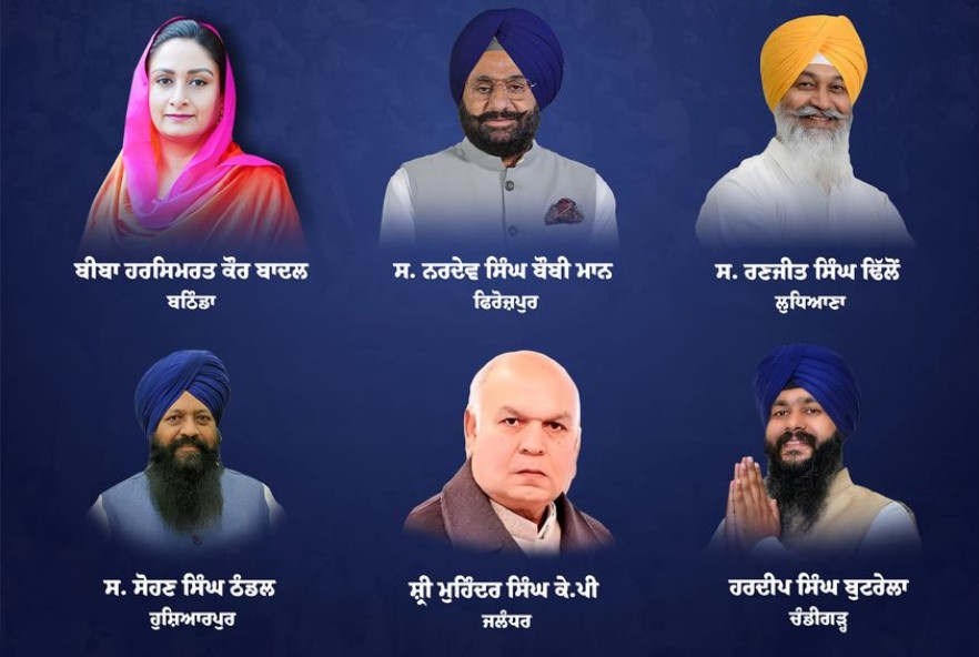 ਸ਼੍ਰੋਮਣੀ ਅਕਾਲੀ ਦਲ ਨੇ ਹਰਸਿਮਰਤ ਬਾਦਲ ਨੂੰ ਬਠਿੰਡਾ, ਮਹਿੰਦਰ ਸਿੰਘ ਕੇਪੀ ਨੂੰ ਜਲੰਧਰ, ਸੋਹਣ ਸਿੰਘ ਠੰਡਲ ਨੂੰ ਹੁਸ਼ਿਆਰਪੁਰ, ਰਣਜੀਤ ਸਿੰਘ ਢਿੱਲੋਂ ਨੂੰ ਲੁਧਿਆਣਾ, ਨਰਦੇਵ ਸਿੰਘ ਮਾਨ ਨੂੰ ਫਿਰੋਜ਼ਪੁਰ ਤੇ ਹਰਦੀਪ ਸਿੰਘ ਨੂੰ ਚੰਡੀਗੜ੍ਹ ਤੋਂ ਮੈਦਾਨ ’ਚ ਉਤਾਰਿਆ
