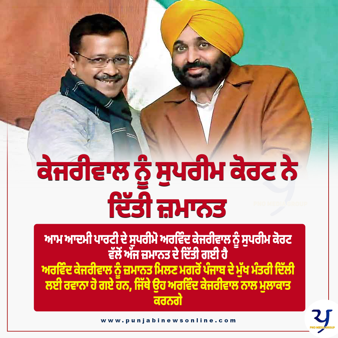 ਦਿੱਲੀ ਦੇ ਮੁੱਖ ਮੰਤਰੀ ਅਤੇ ਆਮ ਆਦਮੀ ਪਾਰਟੀ ਦੇ ਸੁਪਰੀਮੋ ਅਰਵਿੰਦ ਕੇਜਰੀਵਾਲ ਨੂੰ ਸੁਪਰੀਮ ਕੋਰਟ ਵੱਲੋਂ ਅੱਜ ਜ਼ਮਾਨਤ ਦੇ ਦਿੱਤੀ ਗਈ ਹੈ। ਅਰਵਿੰਦ ਕੇਜਰੀਵਾਲ ਨੂੰ ਜ਼ਮਾਨਤ ਮਿਲਣ ਮਗਰੋਂ ਪੰਜਾਬ ਦੇ ਮੁੱਖ ਮੰਤਰੀ ਚੰਡੀਗੜ੍ਹ ਤੋਂ ਦਿੱਲੀ ਦੌਰੇ ਲਈ ਰਵਾਨਾ ਹੋ ਗਏ ਹਨ, ਜਿੱਥੇ ਉਹ ਅਰਵਿੰਦ ਕੇਜਰੀਵਾਲ ਨਾਲ ਮੁਲਾਕਾਤ ਕਰਨਗੇ। ਮੁੱਖ ਮੰਤਰੀ ਭਗਵੰਤ ਮਾਨ ਕੇਜਰੀਵਾਲ ਨੂੰ ਮਿਲਣ ਲਈ ਤਿਹਾੜ ਜੇਲ੍ਹ ਵੀ ਜਾ ਸਕਦੇ ਹਨ। ਦੱਸ ਦੇਈਏ ਕਿ ਅਰਵਿੰਦ ਕੇਜਰੀਵਾਲ ਅੱਜ ਸ਼ਾਮ ਤੱਕ ਜੇਲ੍ਹ ਵਿਚੋਂ ਬਾਹਰ ਆ ਸਕਦੇ ਹਨ।