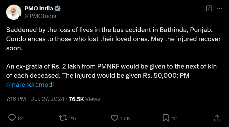 ਬਠਿੰਡਾ ਬੱਸ ਹਾਦਸੇ ‘ਚ 8 ਮੌਤਾਂ : ਪ੍ਰਧਾਨ ਮੰਤਰੀ ਨੇ ਜਤਾਇਆ ਦੁੱਖ