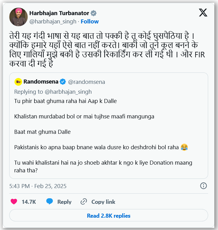 ਇਸ ਪੋਸਟ ਤੋਂ ਬਾਅਦ ਅਤੇ ਹਰਭਜਨ ਸਿੰਘ ਨੇ ਗਲਤ ਭਾਸ਼ਾ ਦੀ ਵਰਤੋਂ ਨੂੰ ਲੈ ਕੇ ‘ਐਕਸ’ ਟਰੋਲਰ ਨੂੰ ਹਮਲਾਵਰ ਢੰਗ ਨਾਲ ਨਿਸ਼ਾਨਾ ਬਣਾਇਆ। ਉਨ੍ਹਾਂ ਲਿਖਿਆ, ‘‘ਤੁਹਾਡੀ ਗਲਤ ਭਾਸ਼ਾ ਇਹ ਸਪੱਸ਼ਟ ਕਰਦੀ ਹੈ ਕਿ ਤੁਸੀਂ ਘੁਸਪੈਠੀਏ ਹੋ ਕਿਉਂਕਿ ਭਾਰਤ ਦੇ ਲੋਕ ਇਸ ਤਰ੍ਹਾਂ ਦੀਆਂ ਗੱਲਾਂ ਨਹੀਂ ਕਰਦੇ। ਤੁਸੀਂ ਮੈਨੂੰ ਜੋ ਗਾਲ੍ਹਾਂ ਕੱਢੀਆਂ ਸਨ, ਉਨ੍ਹਾਂ ਨੂੰ ਰਿਕਾਰਡ ਕੀਤਾ ਗਿਆ ਸੀ। ਅਤੇ ਐਫ.ਆਈ.ਆਰ. ਦਰਜ ਕੀਤੀ ਗਈ ਹੈ।’’