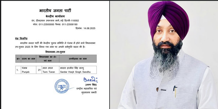 ਭਾਜਪਾ ਨੇ ਤਰਨਤਾਰਨ ਜ਼ਿਮਨੀ ਚੋਣ ਲਈ ਉਮੀਦਵਾਰ ਐਲਾਨ ਦਿੱਤਾ ਹੈ। ਬੀਜੇਪੀ ਨੇ ਤਰਨਤਾਰਨ ਜ਼ਿਮਨੀ ਚੋਣ ਲਈ ਹਰਜੀਤ ਸਿੰਘ ਸੰਧੂ ਨੂੰ ਉਮੀਦਵਾਰ ਬਣਾਇਆ ਹੈ।