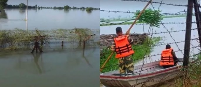 ਪੰਜਾਬ ਤੇ ਜੰਮੂ ਦੇ ਮੂਹਰਲੇ ਇਲਾਕਿਆਂ ’ਚ ਹੜ੍ਹ ਕਾਰਨ ਭਾਰਤ-ਪਾਕਿਸਤਾਨ ਕੌਮਾਂਤਰੀ ਸਰਹੱਦ ’ਤੇ 110 ਕਿਲੋਮੀਟਰ ਤੋਂ ਵੱਧ ਕੰਡਿਆਲੀ ਤਾਰ ਨੁਕਸਾਨੀ ਗਈ ਹੈ ਅਤੇ ਬੀ ਐੱਸ ਐੱਫ ਦੀਆਂ ਤਕਰੀਬਨ 90 ਚੌਕੀਆਂ ਪਾਣੀ ’ਚ ਡੁੱਬ ਗਈਆਂ ਹਨ। ਬੀ ਐੱਸ ਐੱਫ ਜੰਮੂ ’ਚ ਤਕਰੀਬਨ 192 ਕਿਲੋਮੀਟਰ ਤੇ ਪੰਜਾਬ ’ਚ ਤਕਰੀਬਨ 553 ਕਿਲੋਮੀਟਰ ਲੰਮੀ ਕੌਮਾਂਤਰੀ ਸਰਹੱਦ ਦੀ ਰਾਖੀ ਕਰਦੀ ਹੈ।ਅਧਿਕਾਰੀਆਂ ਨੇ ਦੱਸਿਆ ਕਿ ਪੰਜਾਬ ’ਚ ਕੌਮਾਂਤਰੀ ਸਰਹੱਦ ’ਤੇ ਲੱਗੀ ਤਕਰੀਬਨ 80 ਕਿਲੋਮੀਟਰ ਅਤੇ ਜੰਮੂ ’ਚ ਤਕਰੀਬਨ 30 ਕਿਲੋਮੀਟਰ ਲੰਮੀ ਕੰਡਿਆਲੀ ਤਾਰ ਹੜ੍ਹ ਕਾਰਨ ਜਾਂ ਤਾਂ ਡੁੱਬ ਗਈ ਹੈ, ਉੱਖੜ ਗਈ ਜਾਂ ਝੁਕ ਗਈ ਹੈ। ਹੜ੍ਹ ਕਾਰਨ ਜੰਮੂ ’ਚ ਬੀ ਐੱਸ ਐੱਫ ਦੀਆਂ ਤਕਰੀਬਨ 20 ਤੇ ਪੰਜਾਬ 65-67 ਚੌਕੀਆਂ ਪਾਣੀ ’ਚ ਡੁੱਬ ਗਈਆਂ ਹਨ।