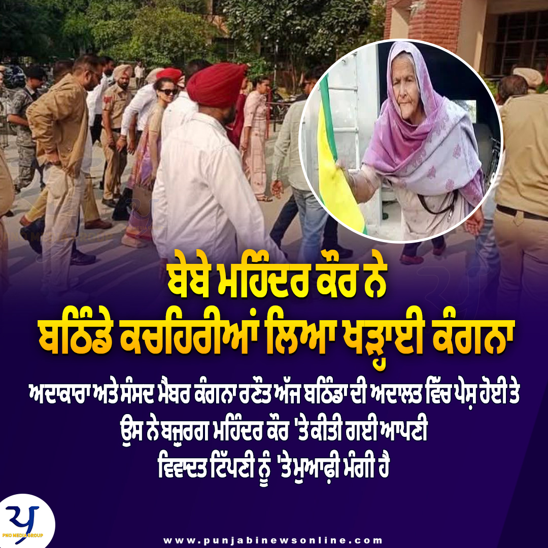 ਭਾਰਤੀ ਜਨਤਾ ਪਾਰਟੀ ਦੀ ਮੰਡੀ ਤੋਂ ਸੰਸਦ ਮੈਂਬਰ ਅਤੇ ਨਾਮਵਰ ਅਦਾਕਾਰਾ ਕੰਗਣਾ ਰਣੌਤ ਨੇ ਮਾਣਹਾਨੀ ਮਾਮਲੇ ਵਿੱਚ ਅੱਜ ਮਾਫੀ ਮੰਗ ਲਈ ਹੈ। ਬਠਿੰਡਾ ਅਦਾਲਤ ਨੇ ਅੱਜ ਕੰਗਣਾ ਰਣੌਤ ਨੂੰ ਪੇਸ਼ ਹੋਣ ਦੇ ਹੁਕਮ ਦਿੱਤੇ ਸਨ। ਕੰਗਨਾ ਰਣੌਤ ਤਕਰੀਬਨ 2 ਵੱਜ ਕੇ ਦੋ ਮਿੰਟ ਤੇ ਭਾਰੀ ਸੁਰੱਖਿਆ ਹੇਠ ਅਦਾਲਤ ਪੁੱਜੀ ਸੀ। ਅਦਾਲਤੀ ਕਾਰਵਾਈ ਮੁਕੰਮਲ ਕਰਨ ਤੋਂ ਬਾਅਦ ਮੀਡੀਆ ਨਾਲ ਗੱਲਬਾਤ ਕਰਦਿਆਂ ਭਾਜਪਾ ਆਗੂ ਕੰਗਣਾ ਰਨੌਤ ਨੇ ਕਿਹਾ ਕਿ ਉਸ ਨੇ ਅੱਜ ਖੇਦ ਪ੍ਰਗਟ ਕਰ ਲਿਆ ਹੈ।