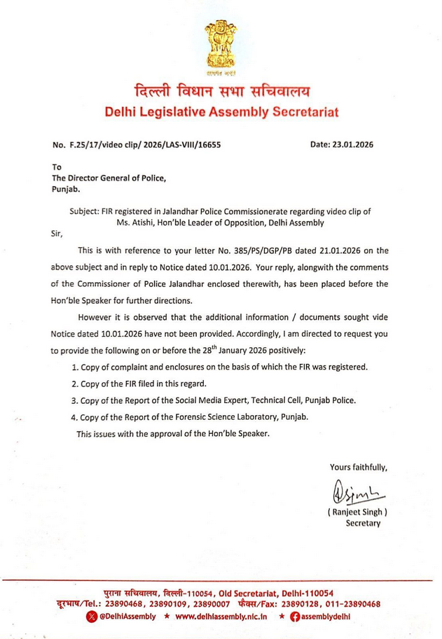 ਦਿੱਲੀ ਦੀ ਸਾਬਕਾ ਮੁੱਖ ਮੰਤਰੀ ਆਤਿਸ਼ੀ ਨਾਲ ਜੁੜੇ ਵੀਡੀਓ ਵਿਵਾਦ ਨੂੰ ਲੈ ਕੇ ਦਿੱਲੀ ਵਿਧਾਨ ਸਭਾ ਦੀ ਵਿਸ਼ੇਸ਼ ਅਧਿਕਾਰ ਕਮੇਟੀ (Privileges Committee) ਨੇ ਵੱਡੀ ਕਾਰਵਾਈ ਕੀਤੀ ਹੈ। ਕਮੇਟੀ ਨੇ ਪੰਜਾਬ ਦੇ ਡਾਇਰੈਕਟਰ ਜਨਰਲ ਆਫ਼ ਪੁਲਿਸ (DGP) ਨੂੰ ਨੋਟਿਸ ਜਾਰੀ ਕਰਦਿਆਂ 28 ਜਨਵਰੀ 2026 ਤੱਕ ਇਸ ਪੂਰੇ ਮਾਮਲੇ ‘ਤੇ ਆਪਣਾ ਸਪੱਸ਼ਟੀਕਰਨ ਅਤੇ ਜਵਾਬ ਦਾਖ਼ਲ ਕਰਨ ਲਈ ਕਿਹਾ ਹੈ।