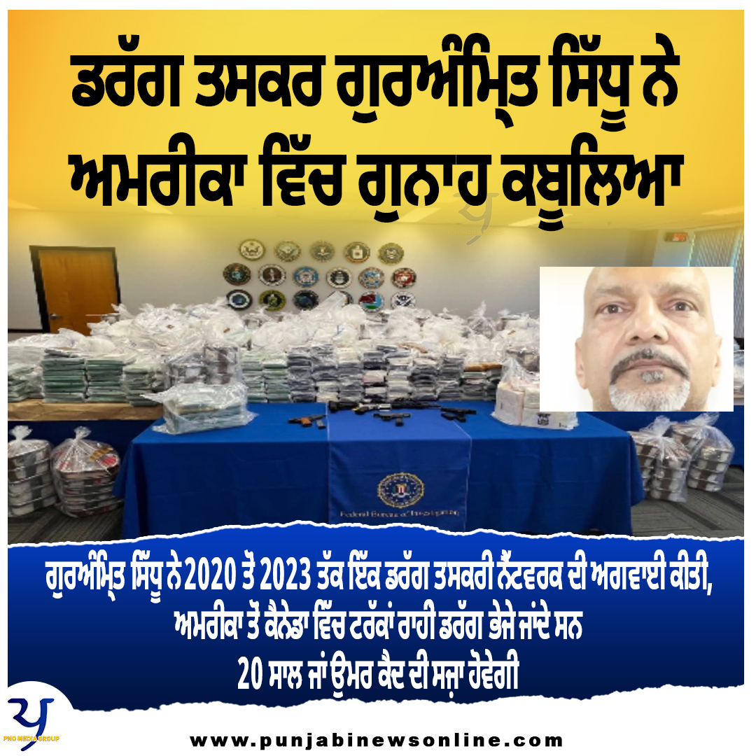 28 ਮਾਰਚ 2026 – ਬਰੈਂਪਟਨ ਦੇ ਗੁਰਅੰਮ੍ਰਿਤ ਸਿੱਧੂ (62) ਨੇ 26 ਮਾਰਚ 2026 ਨੂੰ ਲਾਸ ਏਂਜਲਸ ਦੀ ਅਮਰੀਕੀ ਫੈਡਰਲ ਅਦਾਲਤ ਵਿੱਚ ਆਪਣੇ ਤੇ ਲੱਗੇ ਇੱਕ ਵੱਡੀ ਡਰੱਗ ਤਸਕਰੀ ਗਿਰੋਹ ਦੀ ਅਗਵਾਈ ਦੇ ਦੋਸ਼ ਮੰਨ ਲਏ ਹਨ। ਉਸਨੇ 2020 ਤੋਂ 2023 ਤੱਕ ਇੱਕ ਡਰੱਗ ਤਸਕਰੀ ਨੈੱਟਵਰਕ ਦੀ ਅਗਵਾਈ ਕੀਤੀ, ਜਿਸ ਵਿੱਚ ਅਮਰੀਕਾ ਤੋਂ ਕੈਨੇਡਾ ਵਿੱਚ ਟਰੱਕਾਂ ਰਾਹੀਂ ਡਰੱਗ ਭੇਜੇ ਜਾਂਦੇ ਸਨ। ਇਸ ਵਿੱਚ ਖਾਸ ਤੌਰ ਸਤੰਬਰ-ਅਕਤੂਬਰ 2022 ਵਿੱਚ 8 ਵੱਖ-ਵੱਖ ਲੋਡਾਂ ਵਿੱਚ ਲਗਭਗ 523 ਕਿਲੋਗ੍ਰਾਮ ਮੈਥੈਂਫੇਟਾਮਾਈਨ ਅਤੇ 347 ਕਿਲੋਗ੍ਰਾਮ ਕੋਕੀਨ ਦੀ ਤਸਕਰੀ ਹੋਈ, ਜਿਸਦੀ ਕੀਮਤ ਅਮਰੀਕੀ ਡਾਲਰ ਵਿੱਚ ਲਗਭਗ 15-17 ਮਿਲੀਅਨ ਡਾਲਰ ਸੀ।ਉਸਨੂੰ ਅਕਤੂਬਰ 2024 ਵਿੱਚ ਕੈਨੇਡਾ ਤੋਂ ਅਮਰੀਕਾ ਹਵਾਲੇ ਕੀਤਾ ਗਿਆ ਸੀ ਅਤੇ ਉਦੋਂ ਤੋਂ ਫੈਡਰਲ ਹਿਰਾਸਤ ਵਿੱਚ ਹੈ। ਉਸ ਨੂੰ ਹੁਣ 9 ਜੁਲਾਈ 2026 ਨੂੰ ਸਜ਼ਾ ਸੁਣਾਈ ਜਾਵੇਗੀ। ਇਸ ਘੱਟੋ-ਘੱਟ 20 ਸਾਲ ਦੀ ਤੇ ਵੱਧ ਤੋਂ ਵੱਧ ਉਮਰ ਕੈਦ ਤੱਕ ਹੋ ਸਕਦੀ ਹੈ।