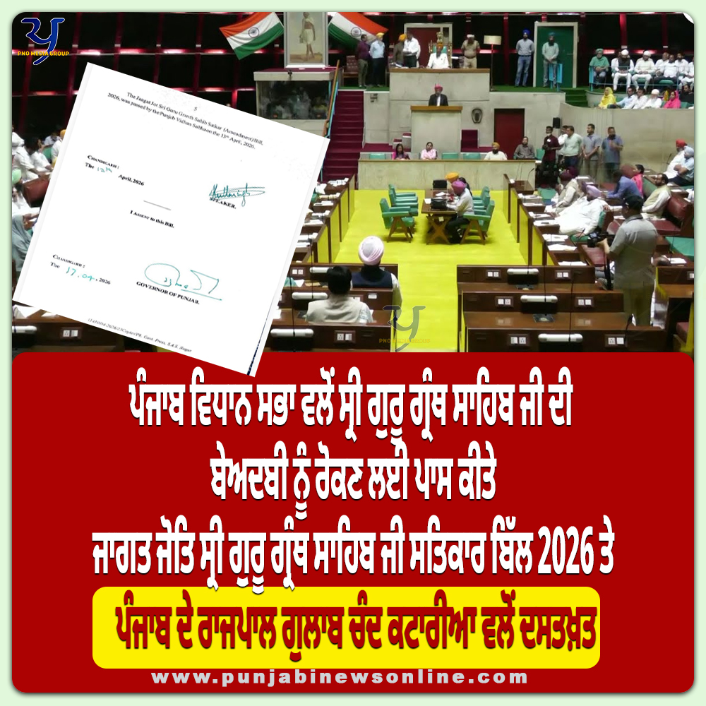 ਪੰਜਾਬ ਦੇ ਰਾਜਪਾਲ ਗੁਲਾਬ ਚੰਦ ਕਟਾਰੀਆ ਨੇ ਪੰਜਾਬ ਵਿਧਾਨ ਸਭਾ ਵਿੱਚ ਪਾਸ ਕੀਤੇ ਗਏ ‘ਜਾਗਤ ਜੋਤ ਸ੍ਰੀ ਗੁਰੂ ਗ੍ਰੰਥ ਸਾਹਿਬ ਸਤਿਕਾਰ ਬਿੱਲ 2026’ ਨੂੰ ਪ੍ਰਵਾਨਗੀ ਦੇ ਦਿੱਤੀ ਹੈ। ਹੁਣ ਇਹ ਬਿੱਲ ਕਾਨੂੰਨ ਬਣ ਗਿਆ ਹੈ। ਇਹ ਬਿੱਲ 13 ਅਪਰੈਲ ਨੂੰ ਵਿਸਾਖੀ ਵਾਲੇ ਦਿਨ ਪੰਜਾਬ ਵਿਧਾਨ ਸਭਾ ਵਿੱਚ ਸਰਬਸੰਮਤੀ ਨਾਲ ਪਾਸ ਕੀਤਾ ਗਿਆ ਸੀ।