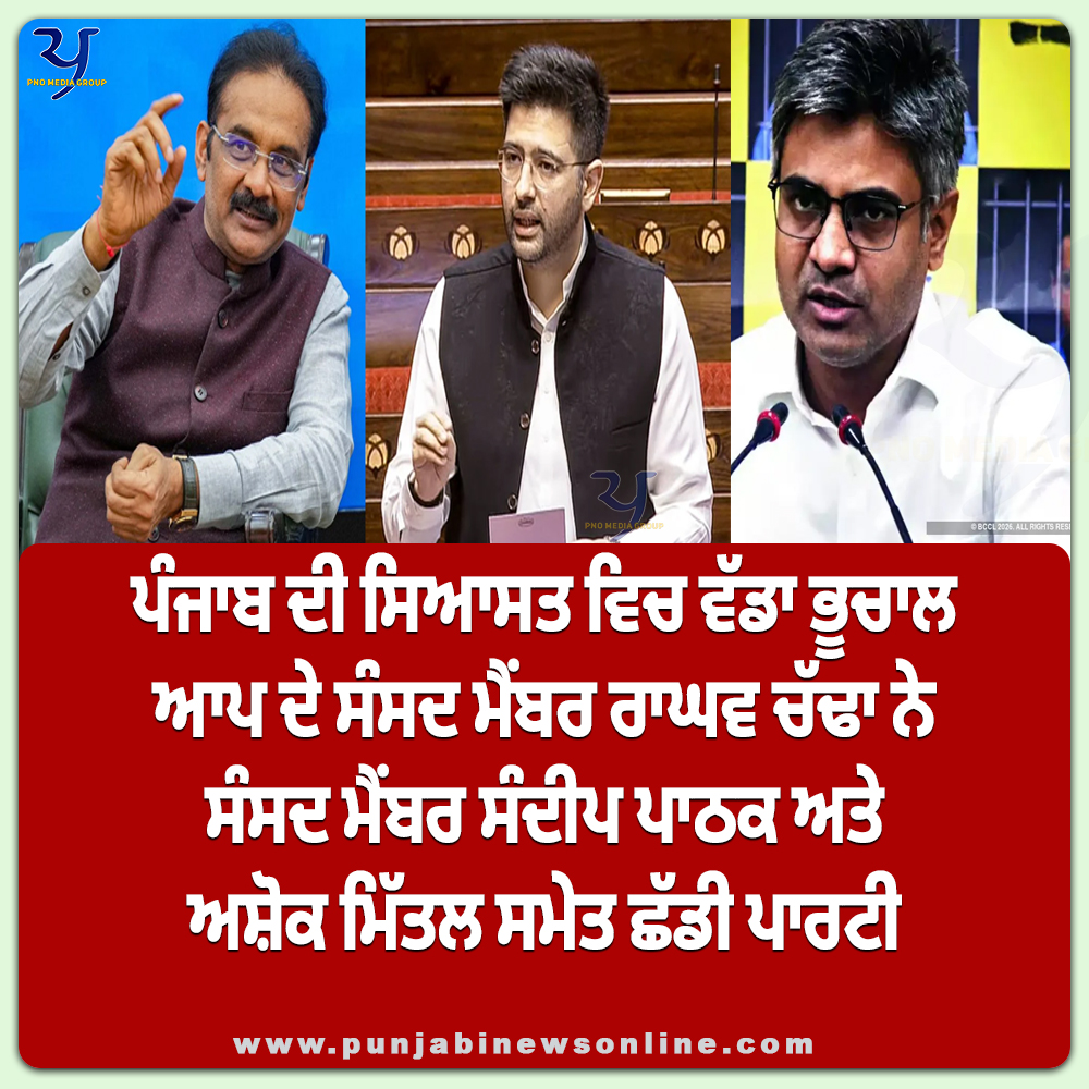 ਆਮ ਆਦਮੀ ਪਾਰਟੀ ਨੂੰ ਵੱਡਾ ਝਟਕਾ ਲੱਗਾ ਹੈ। ਪਾਰਟੀ ਦੇ ਤਿੰਨ ਸੰਸਦ ਮੈਂਬਰਾਂ ਰਾਘਵ ਚੱਢਾ, ਸੰਦੀਪ ਪਾਠਕ ਅਤੇ ਅਸ਼ੋਕ ਮਿੱਤਲ ਨੇ ਪਾਰਟੀ ਛੱਡ ਦਿੱਤੀ ਹੈ। ਉਨ੍ਹਾਂ ਨੇ ਭਾਜਪਾ ‘ਚ ਸ਼ਾਮਲ ਹੋਣ ਦਾ ਐਲਾਨ ਵੀ ਕਰ ਦਿੱਤਾ ਹੈ।ਰਾਘਵ ਚੱਢਾ ਨੇ ਹਰਭਜਨ ਸਿੰਘ, ਵਿਕਰਮ ਸਾਹਨੀ ਅਤੇ ਰਾਜਿੰਦਰ ਗੁਪਤਾ ਦਾ ਵੀ ਜ਼ਿਕਰ ਕੀਤਾ, ਇਹ ਕਹਿੰਦੇ ਹੋਏ ਕਿ ਉਹ ਵੀ ਉਨ੍ਹਾਂ ਦੇ ਨਾਲ ਹਨ।