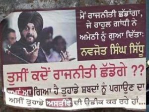 ਕਾਂਗਰਸ ਆਗੂ ਨਵਜੋਤ ਸਿੰਘ ਸਿੱਧੂ ਦੇ ਰਾਜਨੀਤੀ ਤੋਂ ਸੰਨਿਆਸ ਦੀ ਮੰਗ ਲਈ ਪੰਜਾਬ ਵਿੱਚ ਪੋਸਟਰ ਲੱਗੇ ਹਨ। ਮੋਹਾਲੀ ਵਿਚ ਕੰਧਾਂ ਉਤੇ ਪੋਸਟਰ ਲਾਏ ਗਏ ਹਨ, ਜਿਨ੍ਹਾਂ ਵਿਚ ਨਵਜੋਤ ਸਿੰਘ ਸਿੱਧੂ ਨੂੰ ਪੁੱਛਿਆ ਗਿਆ ਹੈ ਕਿ ਤੁਸੀਂ ਰਾਜਨੀਤੀ ਕਦੋਂ ਛੱਡ ਰਹੇ ਹੋ? ਨਵਜੋਤ ਸਿੰਘ ਸਿੱਧੂ ਦੀ ਫੋਟੋ ਲਗੇ ਪੋਸਟਰਵਿਚ ਲਿਖਿਆ ਗਿਆ ਹੈ – ਤੁਸੀਂ ਰਾਜਨੀਤੀ ਕਦੋਂ ਛੱਡ ਰਹੇ ਹੋ? ਸਮਾਂ ਆ ਗਿਆ ਹੈ ਕਿ ਤੁਸੀਂ ਆਪਣਾ ਵਾਅਦਾ ਨਿਭਾਓ। ਅਸੀਂ ਤੁਹਾਡੇ ਅਸਤੀਫੇ ਦੀ ਉਡੀਕ ਕਰ ਰਹੇ ਹਾਂ।